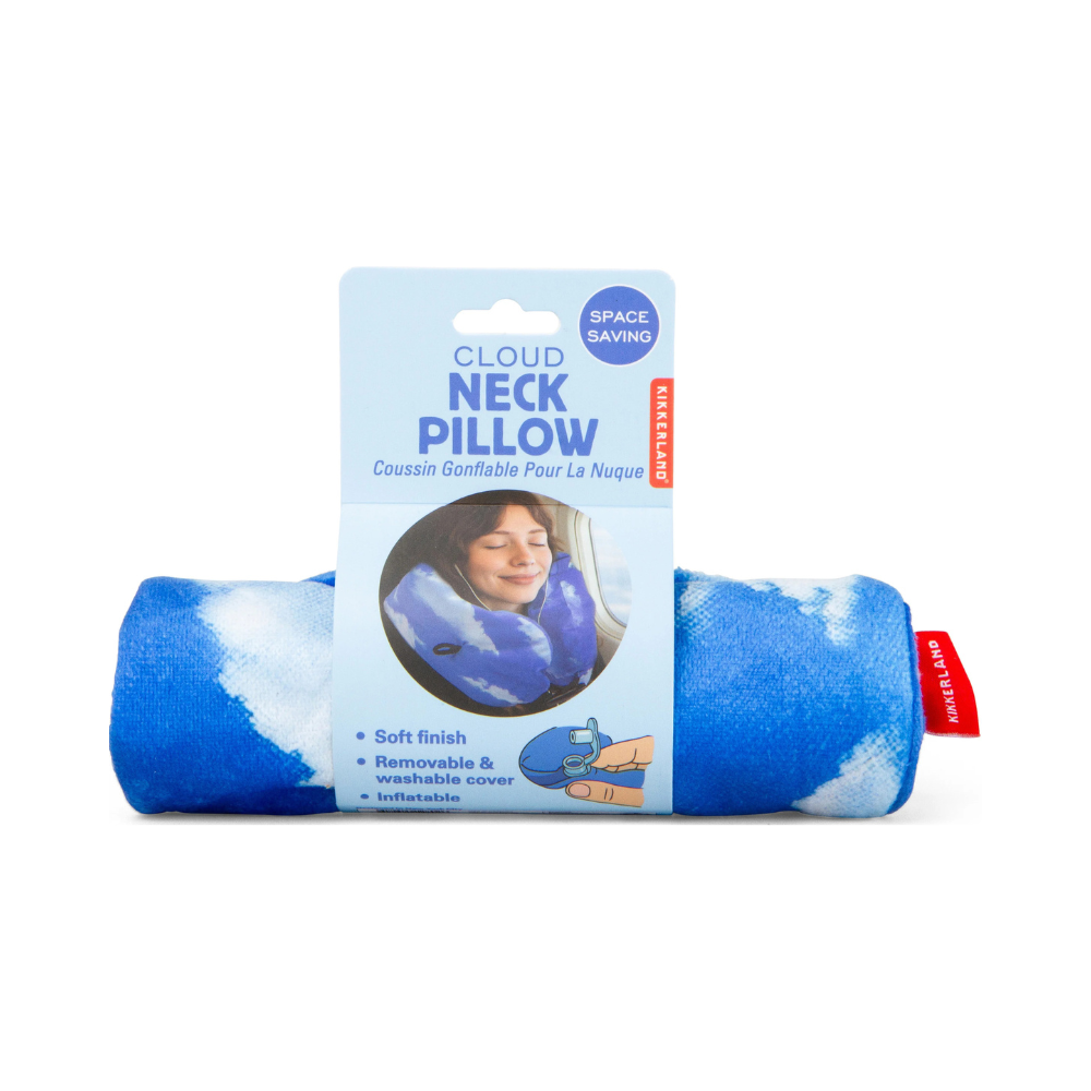 The Kikkerland Cloud Neck Pillow is a soft, inflatable travel pillow that easily inflates and deflates, rolls up for compact storage, and features a removable, washable cover for simple cleaning.