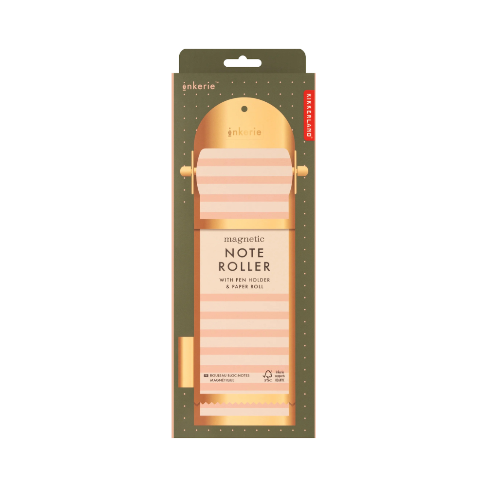 The Kikkerland Inkerie Magnetic Note Roller is a sleek, magnetic dispenser for note rolls. It’s designed to stick to metal surfaces like fridges or lockers and comes with a pen holder — ideal for quick notes, shopping lists, or reminders.