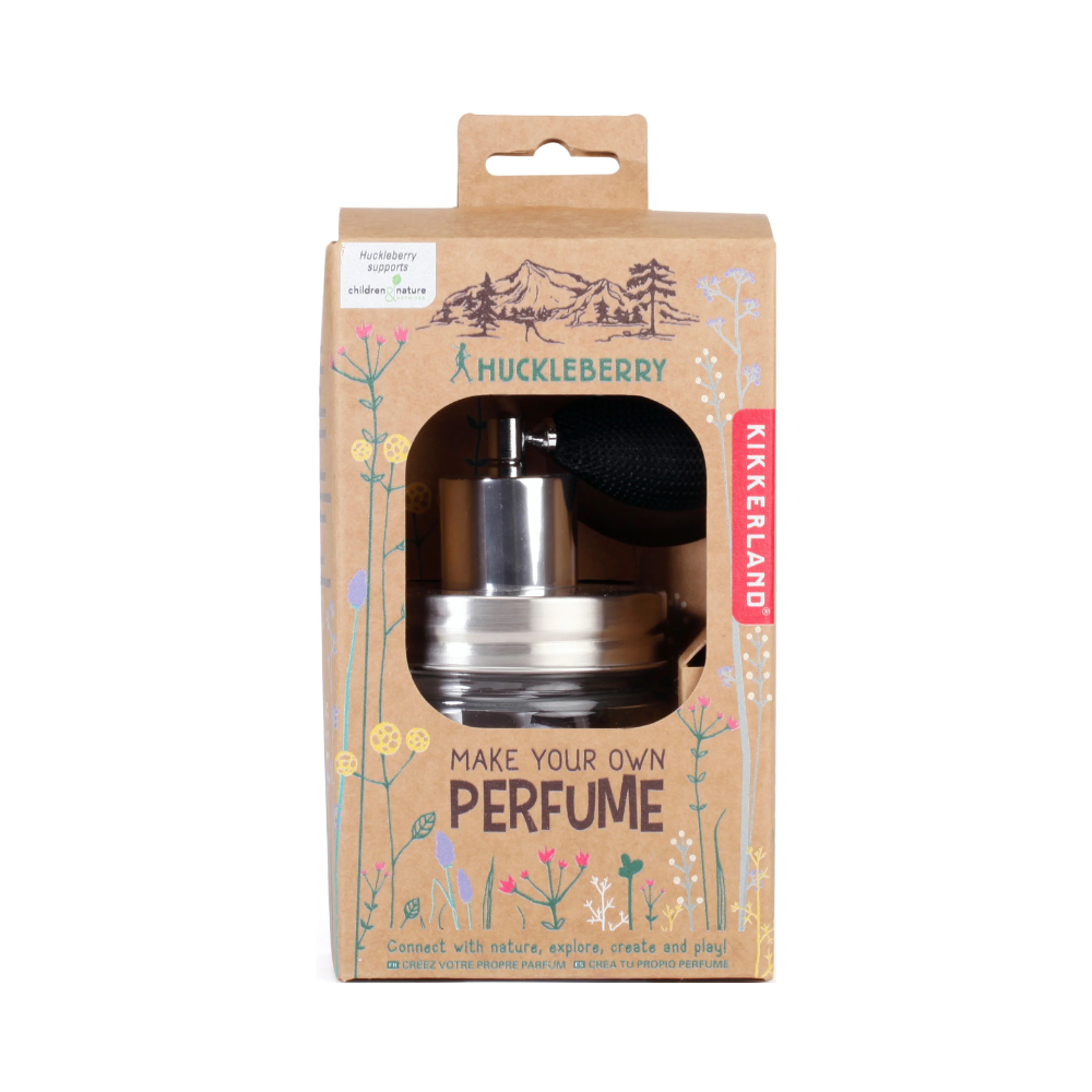 The Kikkerland Huckleberry Make Your Own Perfume kit lets you collect your favorite flowers and herbs, infuse them to create natural scents, and blend them into your own personal perfume. The set includes a mesh bag for steeping, sticker labels to name your creations, and a refillable glass bottle with an atomizer — great for creative outdoor exploration and sensory play.