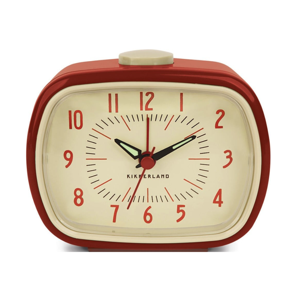 The Kikkerland Retro Alarm Clock – Red brings vintage style with bright, bold color. Its red plastic case and ivory face create a classic retro feel. The clock features glow-in-the-dark hands for low-light visibility and a traditional beeping alarm — great for your bedside table or desk.