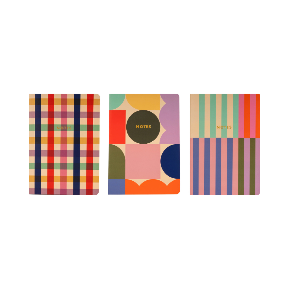 The Kikkerland Set of 3 A5 Notebooks is a bundle of three slim, stitch‑bound notebooks with bold, eye-catching covers — perfectly sized to slip into your bag. Each notebook has 32 pages of lined paper with 6 mm spacing, making them great for notes, lists, or journaling.