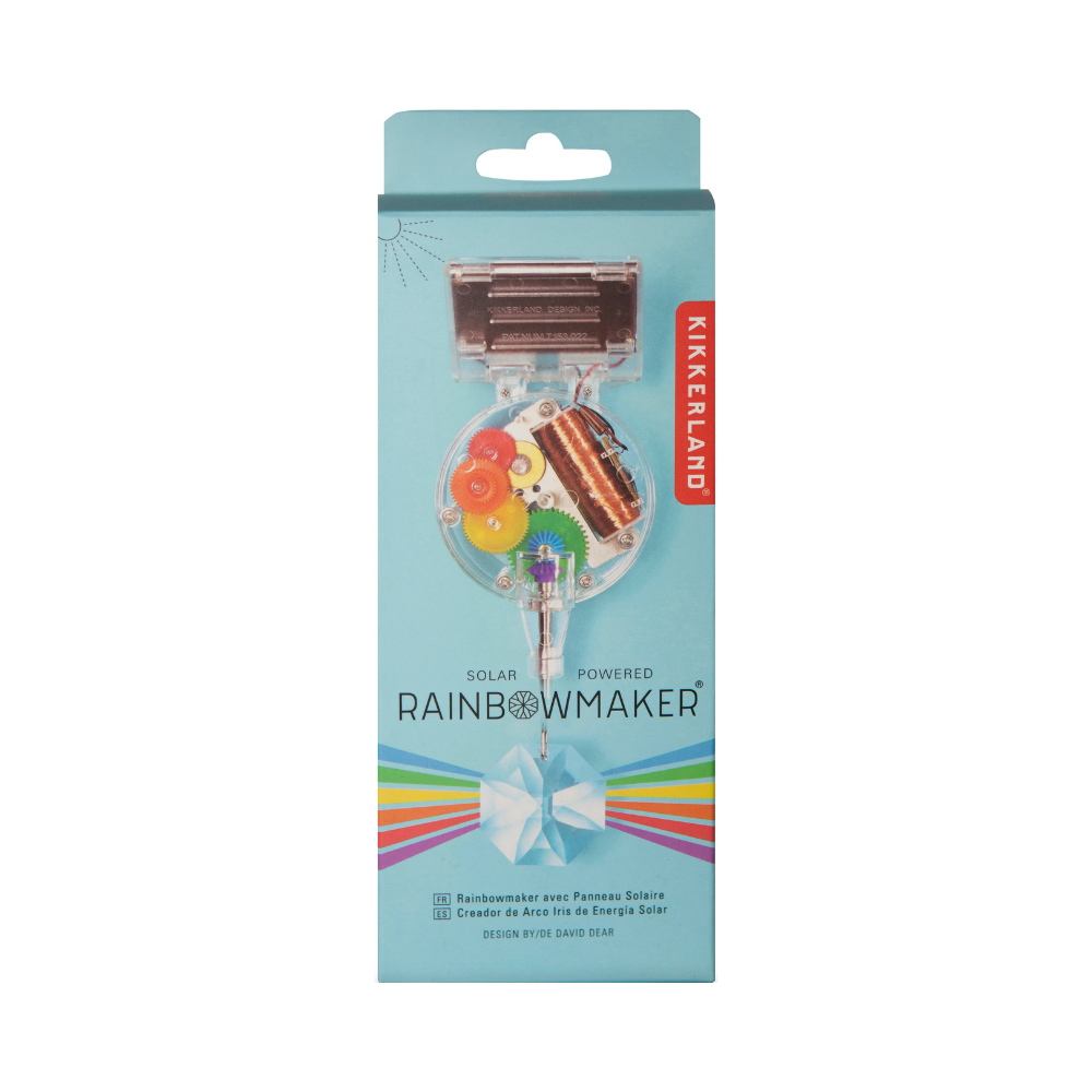 The Kikkerland Solar Powered RainbowMaker is a window suncatcher that uses sunlight to spin a crystal, creating vibrant rainbow patterns inside your room. It mounts via a suction cup and runs entirely on solar power.