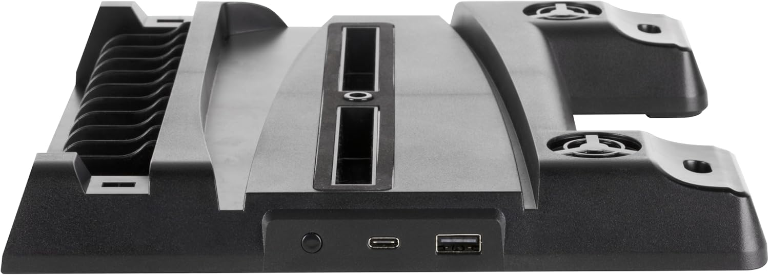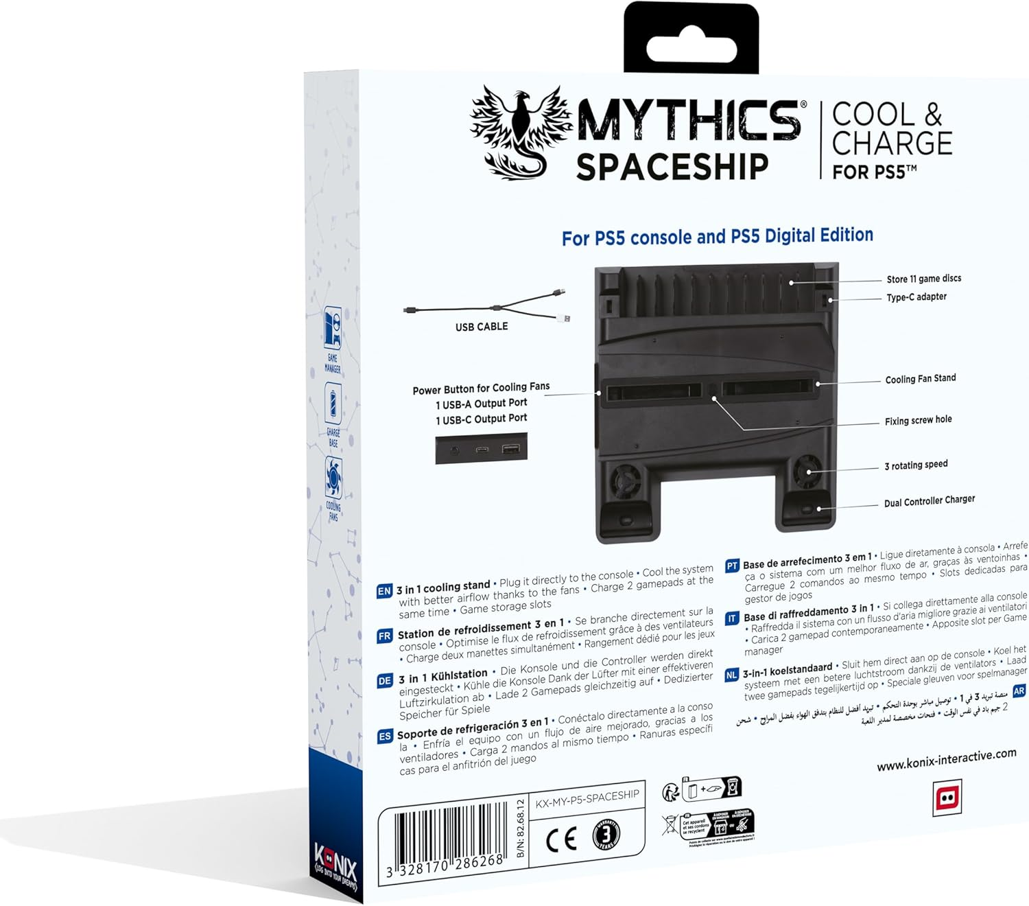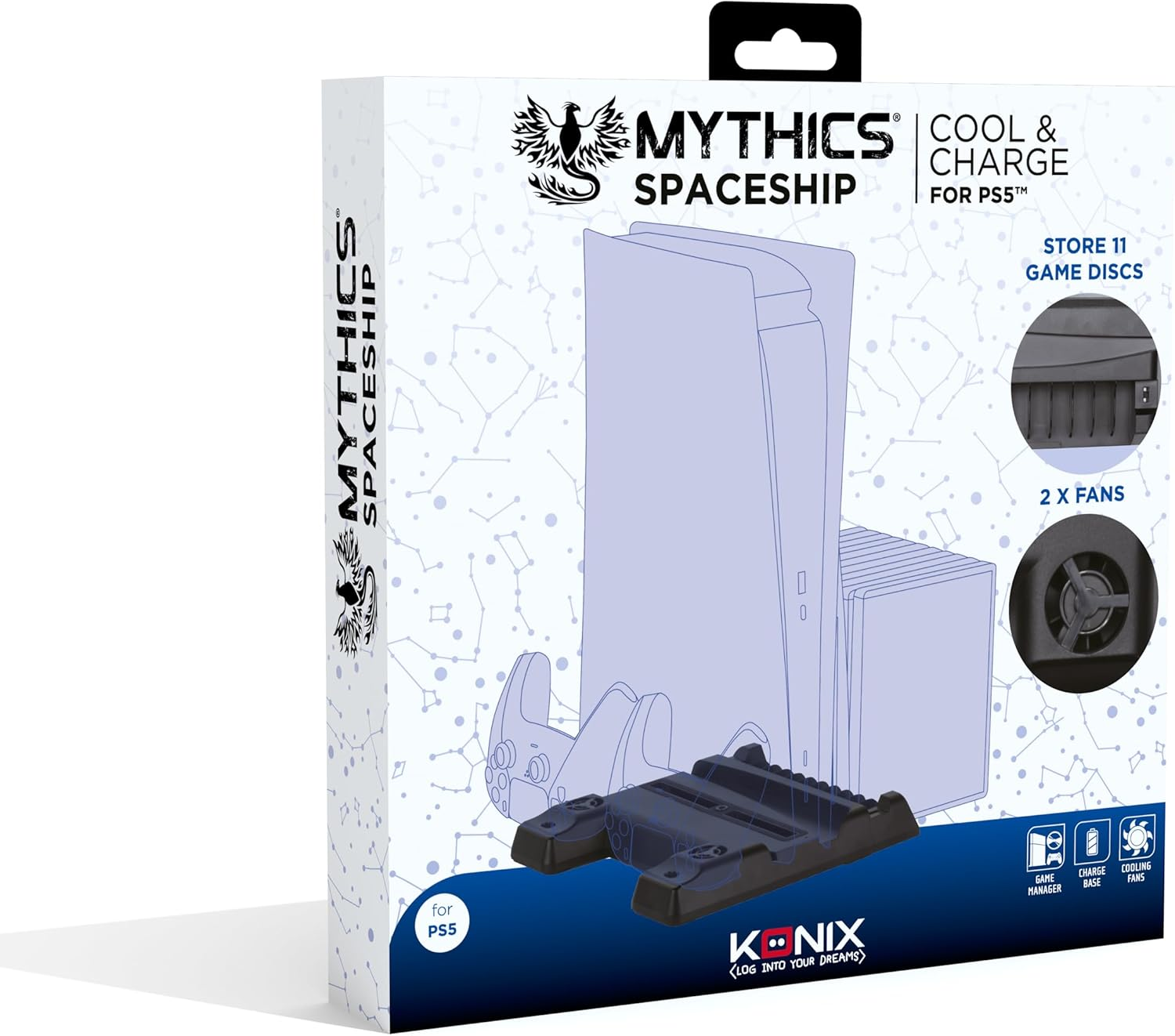 The Konix Mythics Spaceship PS5 Console Cooler + Charging Station + Game Holder is a multifunctional accessory designed to enhance your PS5 setup. It features two quiet fans to prevent console overheating, charges two DualSense controllers simultaneously, and stores up to 12 games for easy access. Its modern and stylish design complements your gaming space while keeping everything organized.