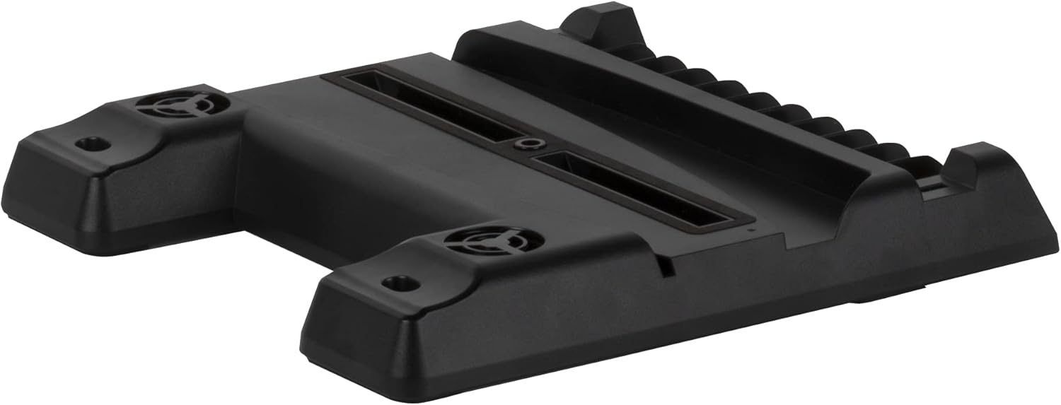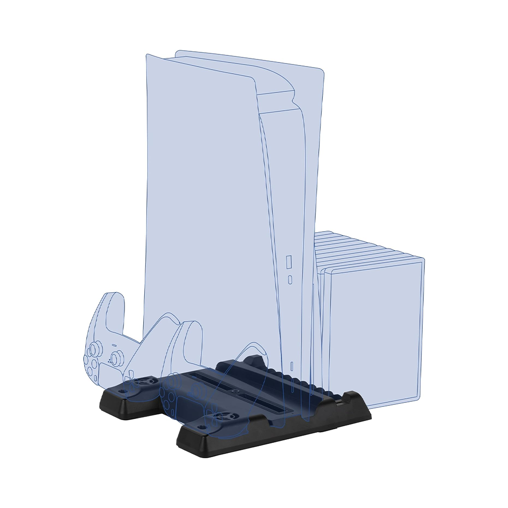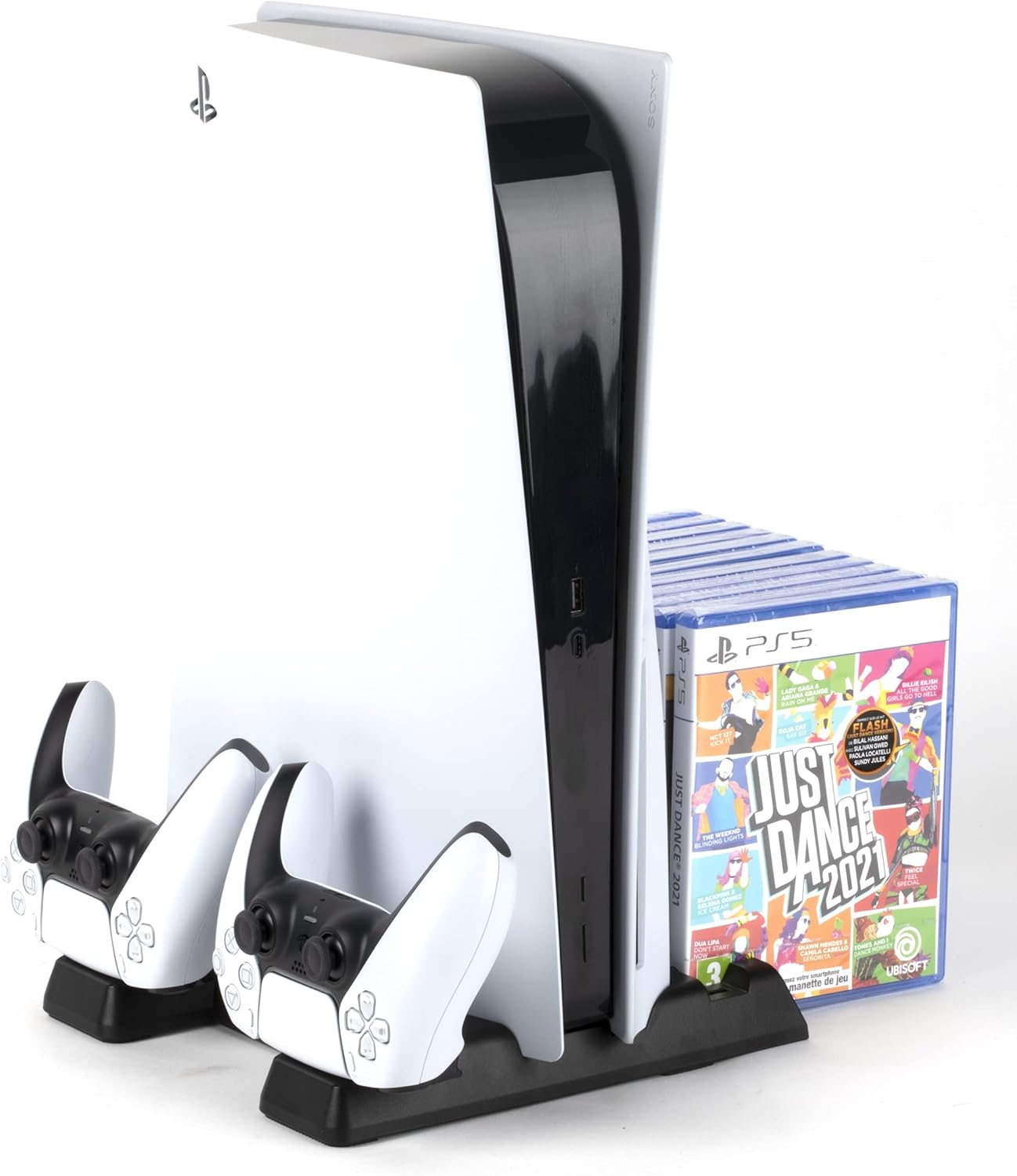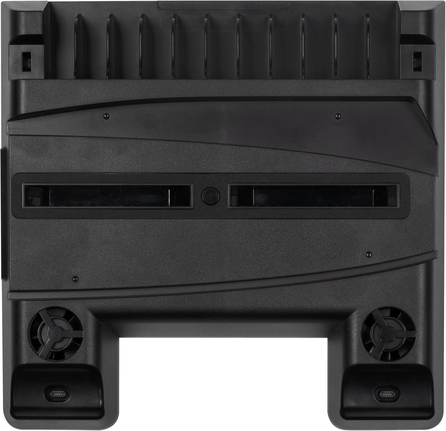 The Konix Mythics Spaceship PS5 Console Cooler + Charging Station + Game Holder is a multifunctional accessory designed to enhance your PS5 setup. It features two quiet fans to prevent console overheating, charges two DualSense controllers simultaneously, and stores up to 12 games for easy access. Its modern and stylish design complements your gaming space while keeping everything organized.