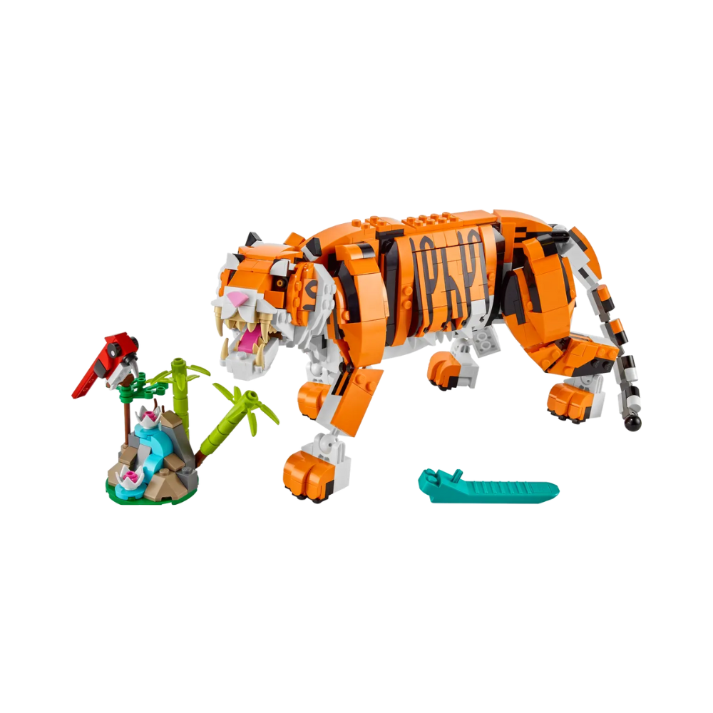 The LEGO® Creator 3-in-1 Majestic Tiger (31129) is a versatile building set that allows builders aged 9 and above to create three different animal models: a majestic tiger, a playful red panda, and a tranquil koi fish. Each model is designed with posable parts, including the tail, legs, body, shoulders, head, and jaw, enabling dynamic poses and expressions. The set also includes mini-models like a red bird, bonsai tree, bamboo, and water lilies to enhance the play experience. With 755 pieces, this set offers a rewarding building experience and endless imaginative play possibilities.