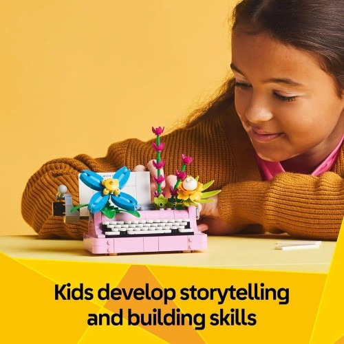 The LEGO® Creator 3-in-1 Typewriter with Flowers (31169) is a versatile building set that offers three distinct models in one box. Builders aged 8 and up can create a vintage typewriter adorned with colorful brick-built flowers, a musical keytar instrument with floral accents, or a charming flowerpot complete with a pen and notebook. This set features 363 pieces, including four vibrant flowers, a moving keyboard, a brick-built sheet of paper, and three decorative stickers with thoughtful phrases. The LEGO Builder app enhances the building experience with interactive 3D instructions and progress tracking.