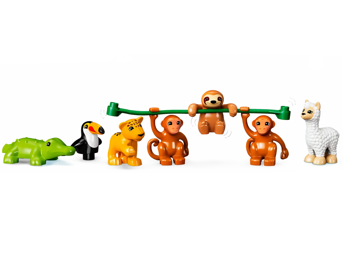 The LEGO® DUPLO® Wild Animals of South America (10973) is a 71-piece set designed for toddlers aged 2 and above. It includes a crocodile, monkeys, sloth, baby jaguar, toucan, and alpaca, along with trees, rocks, and a waterfall to create a vibrant jungle habitat. This set encourages imaginative play, storytelling, and early developmental skills while introducing young children to South American wildlife.