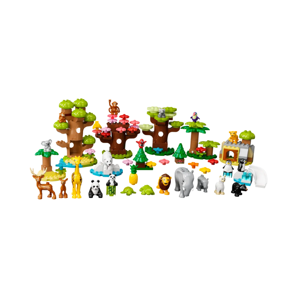 The LEGO® DUPLO® Wild Animals of the World (10975) is a 142-piece set designed for toddlers aged 2 and above. It features animals from all seven continents, including pandas, lions, deer, alpacas, bears, koalas, and penguins. The set includes a foldable world map playmat and a sound brick that plays animal and environmental sounds, providing immersive, educational, and imaginative play.