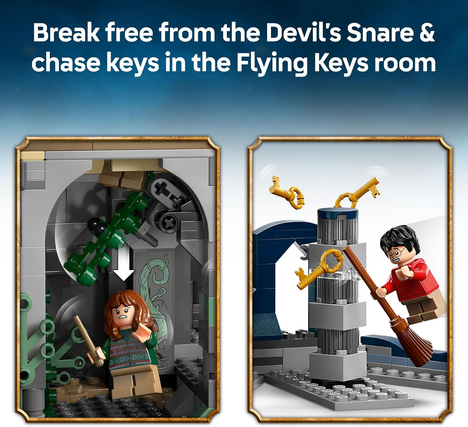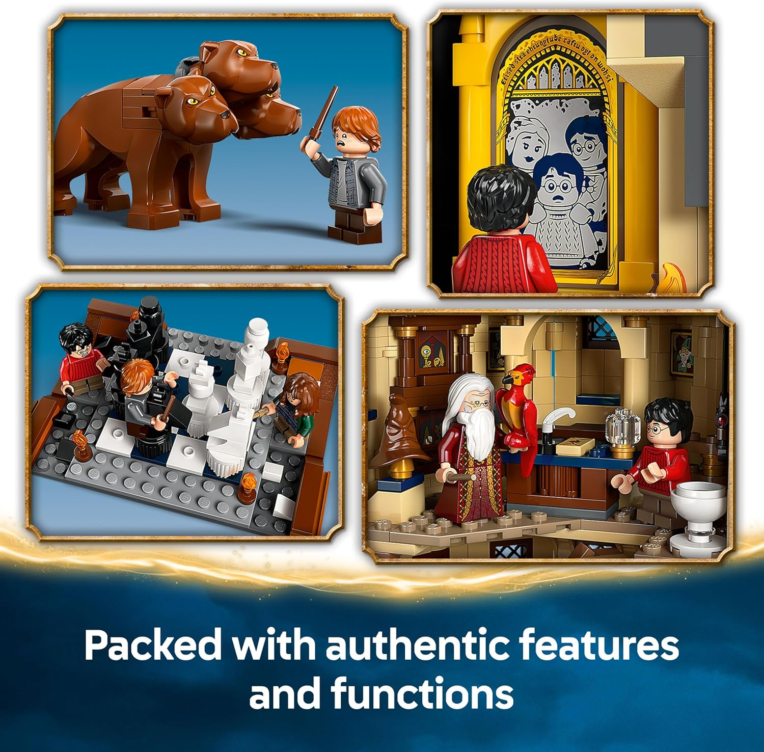 The set includes 12 minifigures, such as Harry Potter, Hermione Granger, Neville Longbottom, Professor Kettleburn, Nearly Headless Nick, and Albus Dumbledore, along with Fluffy, Hedwig, and Fawkes. Fans can explore features like a trapdoor escape from Fluffy’s room, trigger-activated Devil’s Snare, Flying Keys, the swivelling Grand Staircase to Dumbledore’s office, and the Mirror of Erised. Removable rooms, collectible portraits, and modular design encourage customization and imaginative play, making it perfect for display or hands-on storytelling.