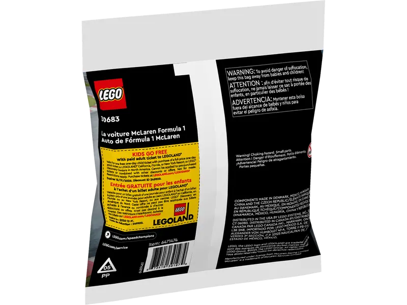 The LEGO® Speed Champions McLaren Formula 1 Car (30683) is a polybag set designed for builders aged 7 and above. This 58-piece set features a detailed microscale model of the McLaren Formula 1 car that competed in the 2023 Formula One World Championship. With authentic design elements and sponsor decals, it’s a must-have for fans of motorsport and LEGO enthusiasts alike.