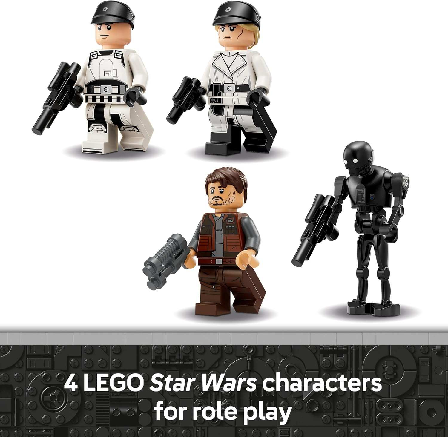 This action-ready set includes four LEGO Star Wars characters: Cassian Andor and Dedra Meero minifigures, each armed with a blaster pistol, alongside an ISB Tactical Agent minifigure and the K-2SO LEGO droid figure. Together, they inspire imaginative role play, epic confrontations, and story-driven adventures straight out of the Star Wars universe.