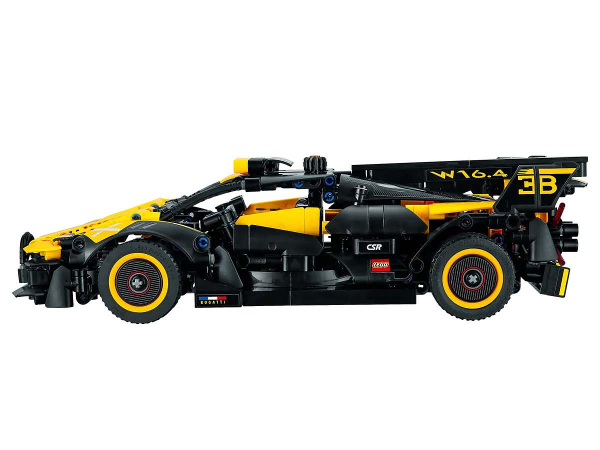 The LEGO® Technic™ Bugatti Bolide (42151) is a 905-piece set designed for builders aged 9 and up. This set features a detailed W16 engine with moving pistons, front-wheel steering, and scissor doors for an authentic hypercar experience. The model is presented in a striking yellow and black color scheme with realistic sticker details. The set offers an engaging building experience and is perfect for LEGO Technic enthusiasts and fans of high-performance cars alike.