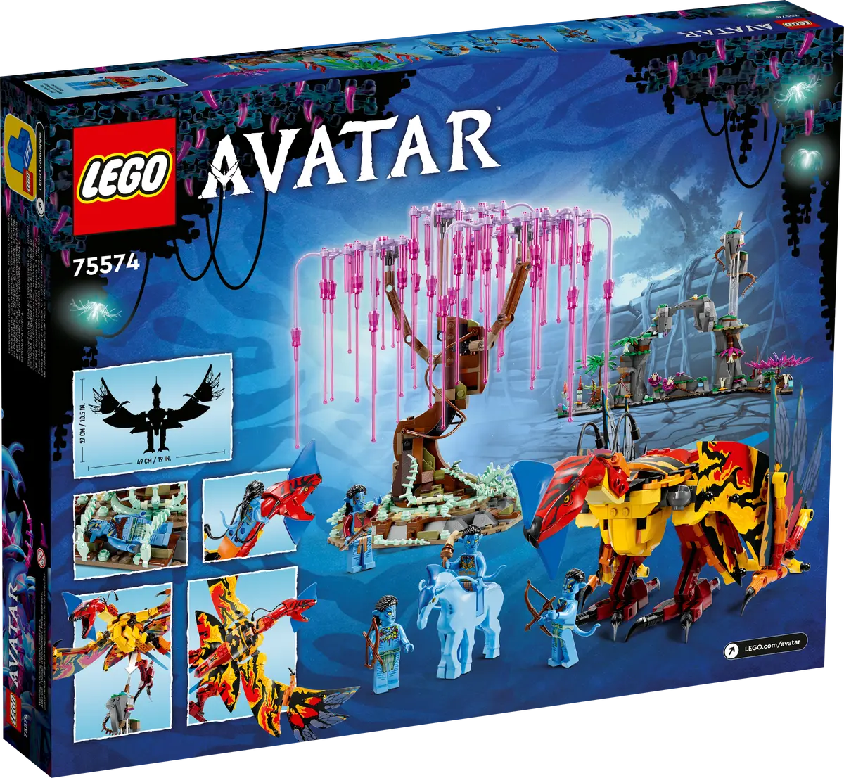 The LEGO® Toruk Makto & Tree of Souls (75574) set, released in 2022, is a 1,212-piece set designed for builders aged 12 and up. Inspired by *Avatar: The Way of Water*, the set allows fans to recreate the iconic scene where Jake Sully bonds with the mighty Toruk and becomes Toruk Makto. It features the majestic Tree of Souls with glow-in-the-dark elements, and three detailed Pandora environment scenes. Included are four Na’vi minifigures: Jake Sully, Neytiri, Mo’at, and Tsu’tey, along with animal figures of Toruk (Leonopteryx) and a Direhorse.