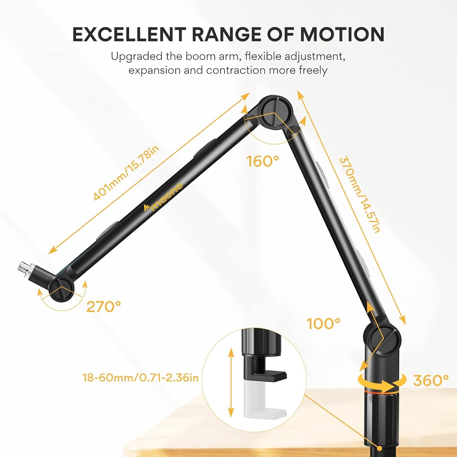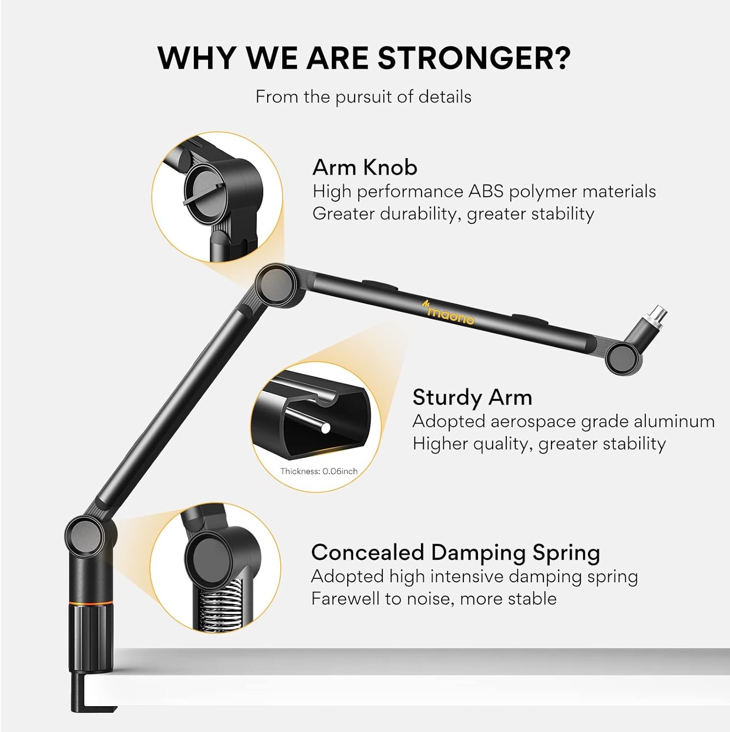 This microphone boom arm features internal tension spring delivers silent and flexible positioning.