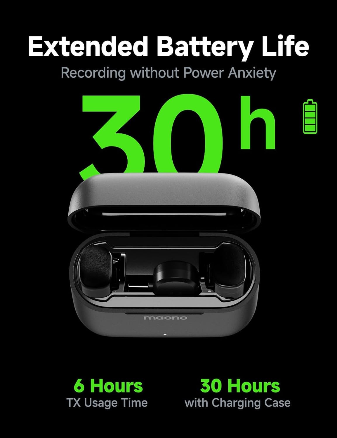 Extended 30-Hour Battery Life: With compact charging case, this small microphone can work for up to 30hours. The receiver allows to charge your device while recording, no more worrying about low battery situation