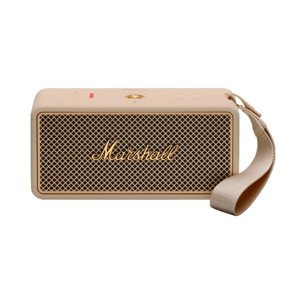 The Marshall Middleton II Portable Bluetooth Speaker (Black, Cream) delivers 360° True Stereophonic sound with rugged outdoor durability. With IP67 water & dust resistance, this speaker is built for travel and adventure. It features dual woofers and tweeters, passive radiators, and a built-in power bank to keep both your music and mobile devices going. Expect up to 30 hours of playback, Bluetooth 5.3 connectivity, and a stylish cream finish with classic Marshall design touches.