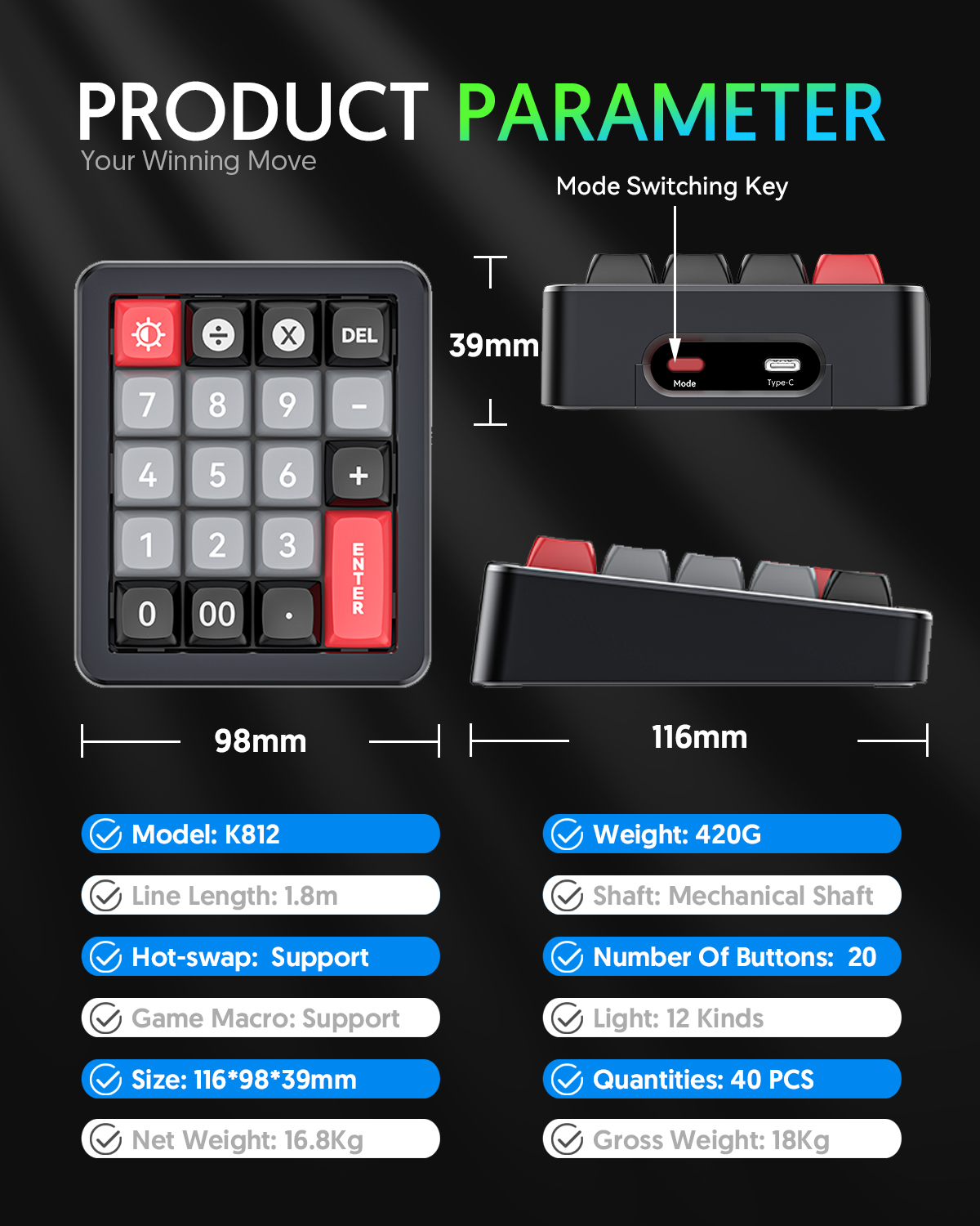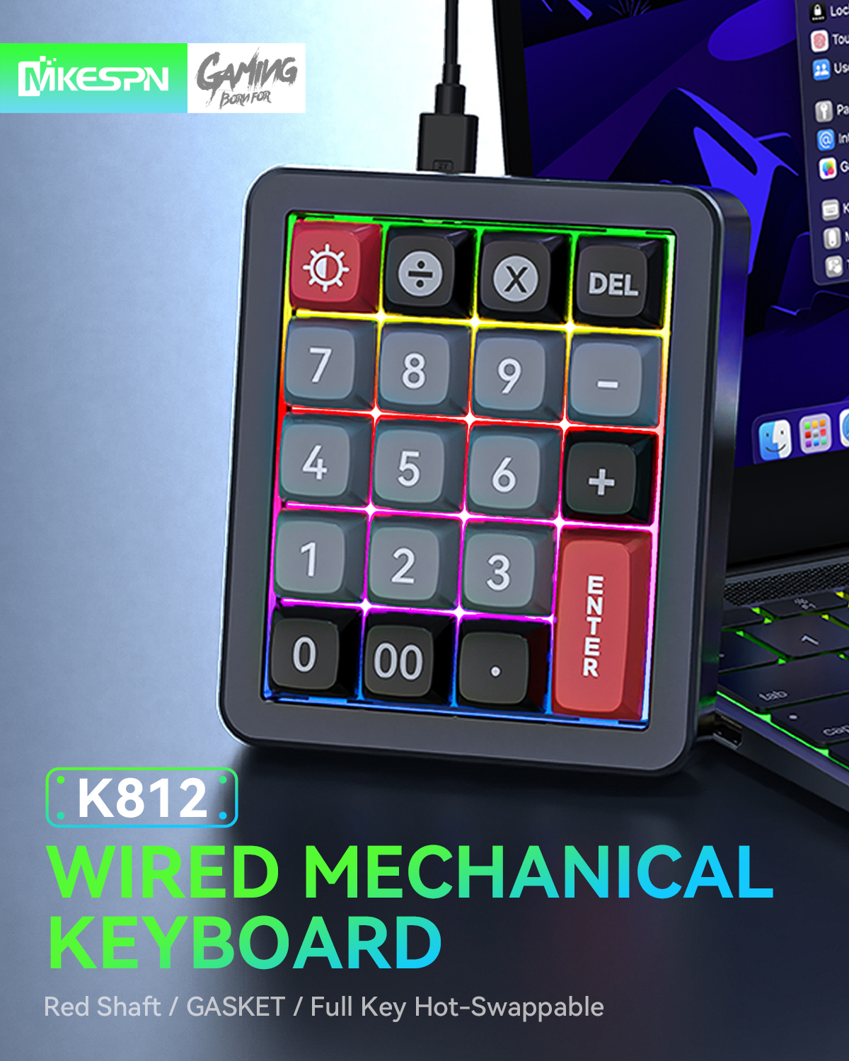 The MKESPN K812 Wired Mechanical Numeric Keypad is a compact and powerful 20-key RGB mechanical keypad designed for gaming, productivity, and macro customization. Featuring Kailh mechanical switches with a lifespan of up to 50 million keystrokes, it delivers a precise, durable, and comfortable typing experience.
