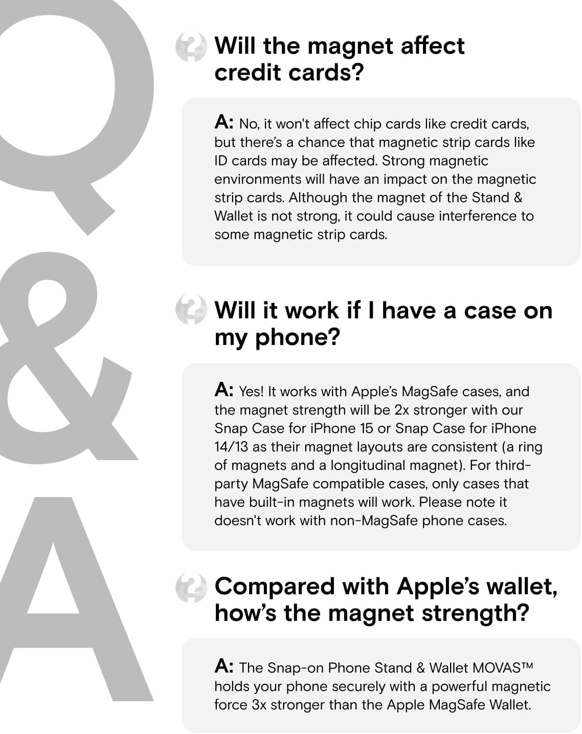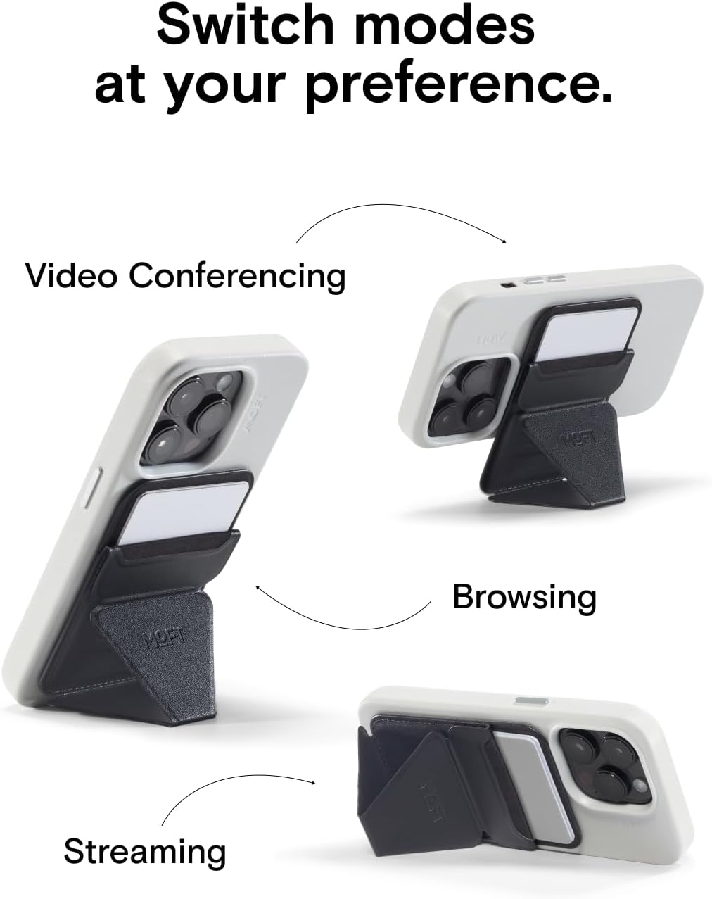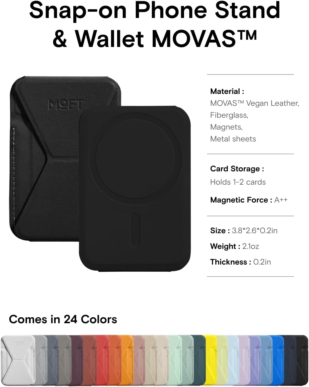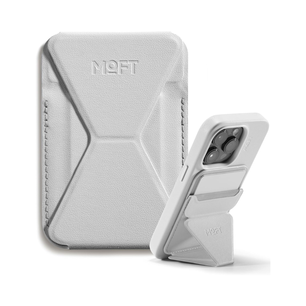 The MOFT Snap-On iPhone Stand & Wallet (MOVAS)  is a slim, multifunctional MagSafe accessory designed for everyday convenience. It combines a sturdy fold-out stand, a secure magnetic wallet, and a comfortable grip in a lightweight profile. Made with premium MOVAS™ vegan leather, it offers enhanced durability, scratch resistance, and long-lasting color retention. With its strong magnetic attachment (up to 15 N), it stays firmly connected to MagSafe-compatible iPhones and cases, while its foldable design enables portrait, landscape, and floating viewing modes. Ideal for minimalists, it carries essential cards while keeping your phone versatile, stable, and easy to handle.