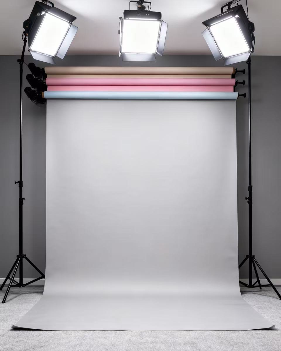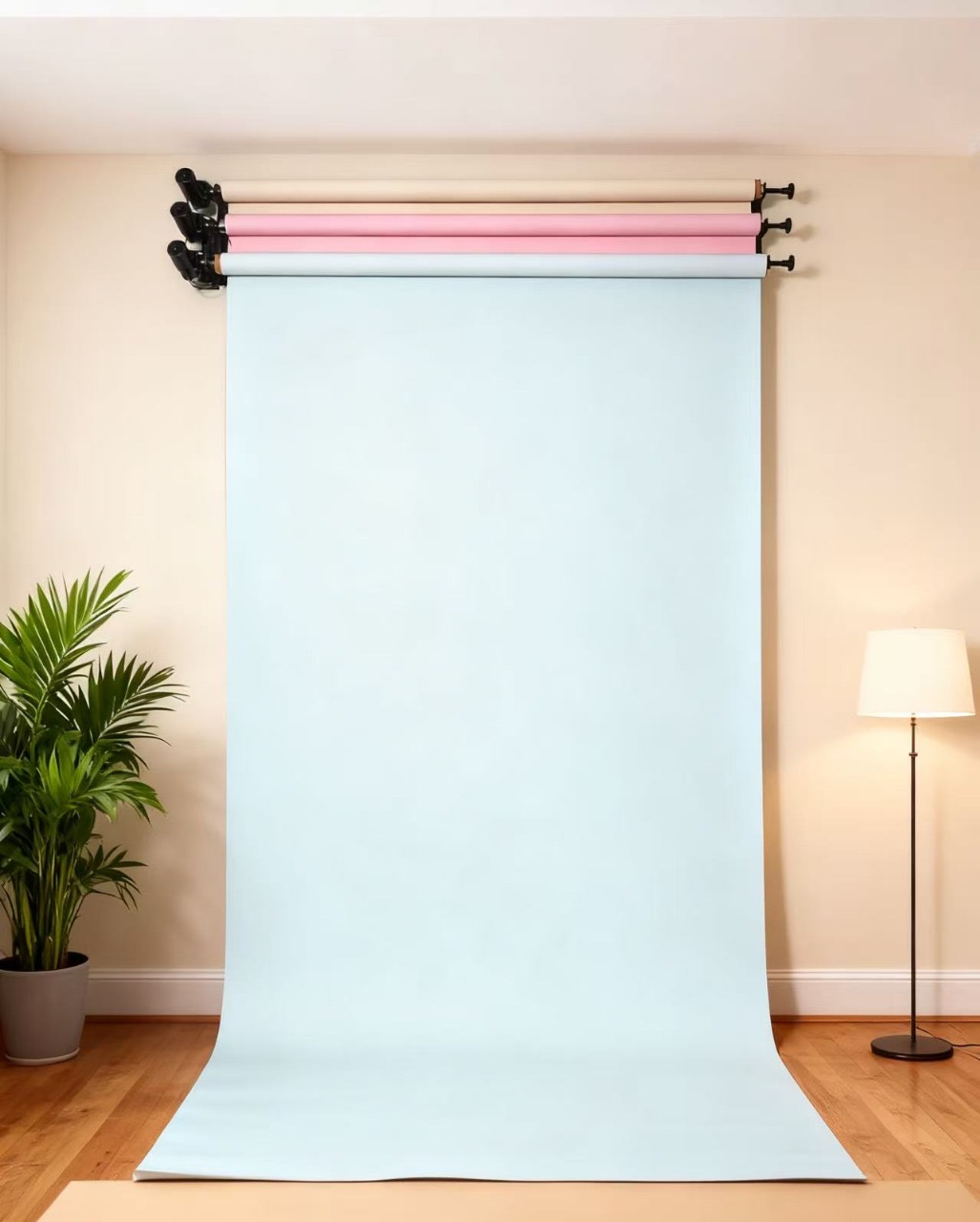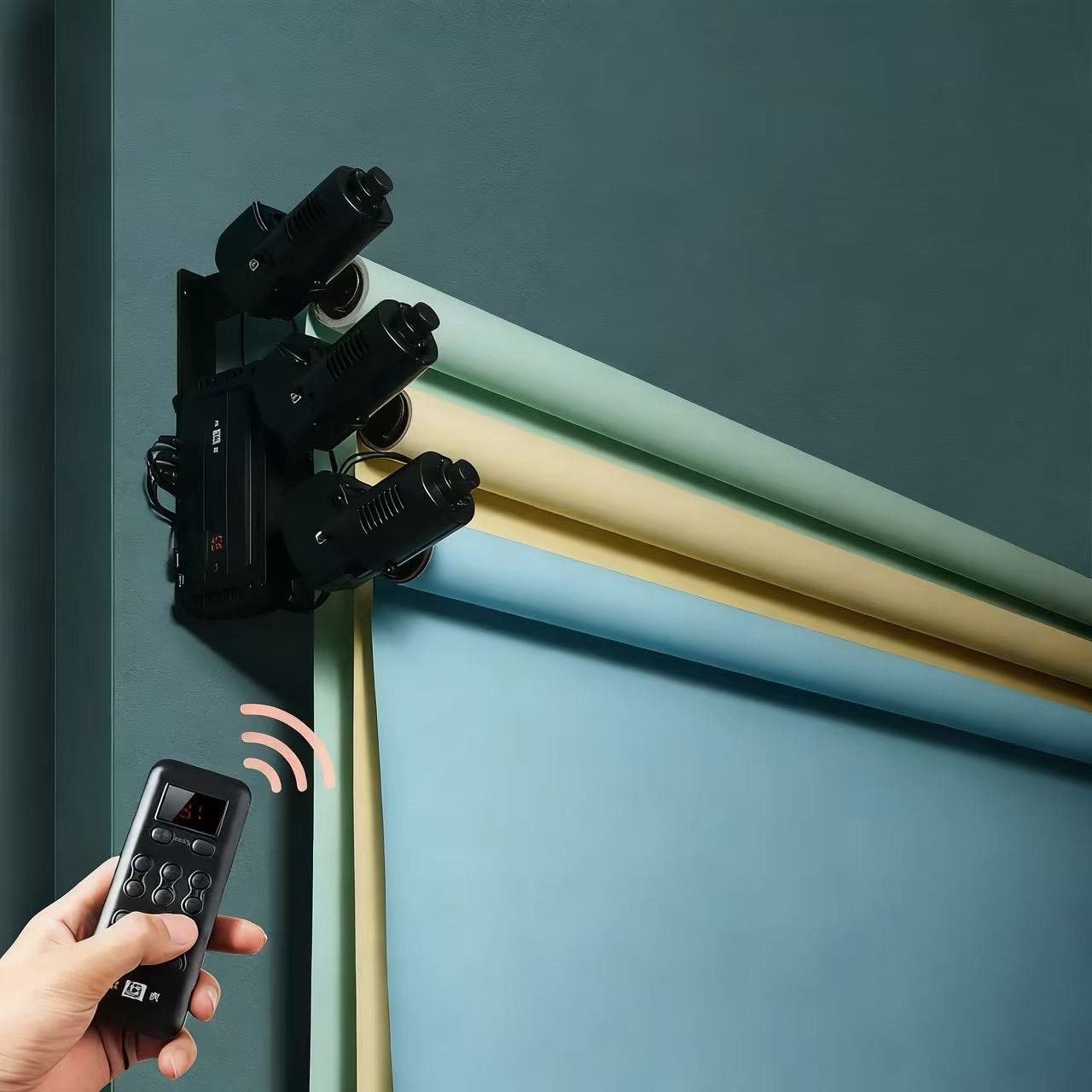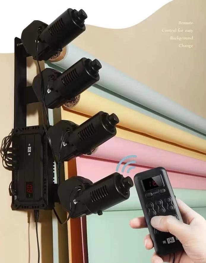 This is an electric background system that allows for automatic lowering and raising of background paper at the push of a button. The system is equipped with motors and can accommodate up to three rolls.