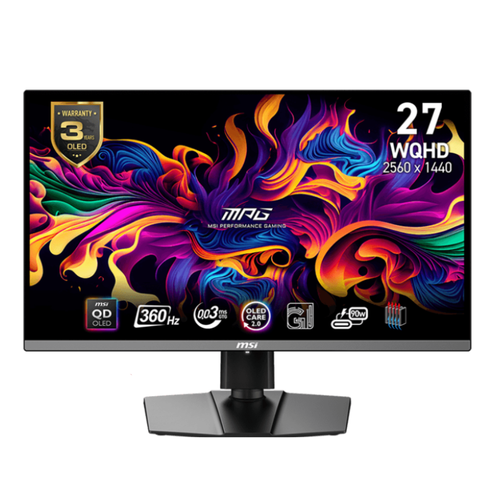 The MSI Gaming Monitor 27″ (MPG 271QRX QD-OLED) is a high-end flat 27‑inch WQHD (2560×1440) display featuring Quantum Dot OLED technology. With an ultra-fast 360 Hz refresh rate and 0.03 ms (GTG) response time, it delivers unparalleled motion clarity, vivid colors, and deep contrast for competitive gaming and immersive experiences. Ergonomic tilt adjustment and VESA mount compatibility provide a customizable setup for long gaming sessions.
