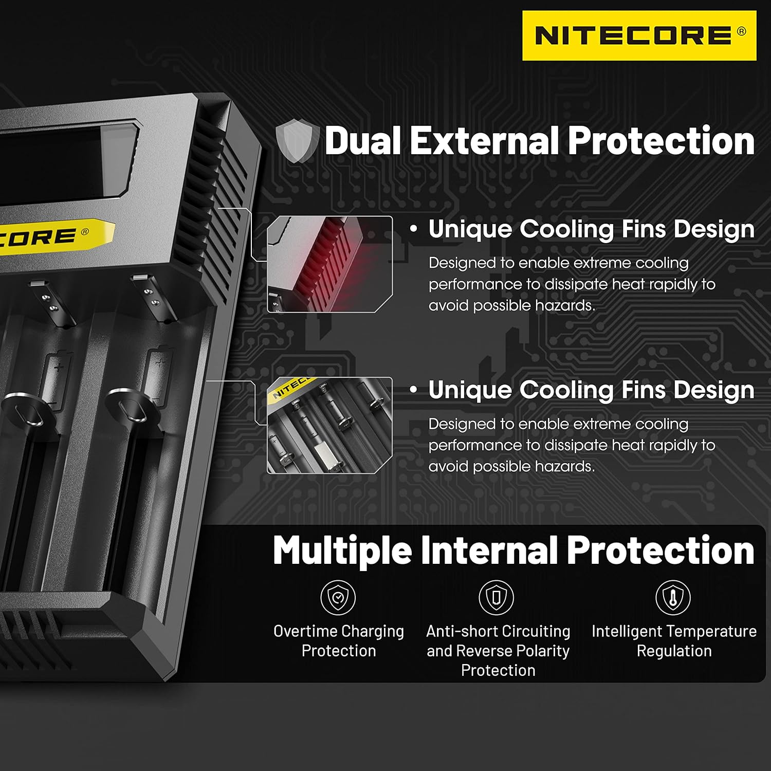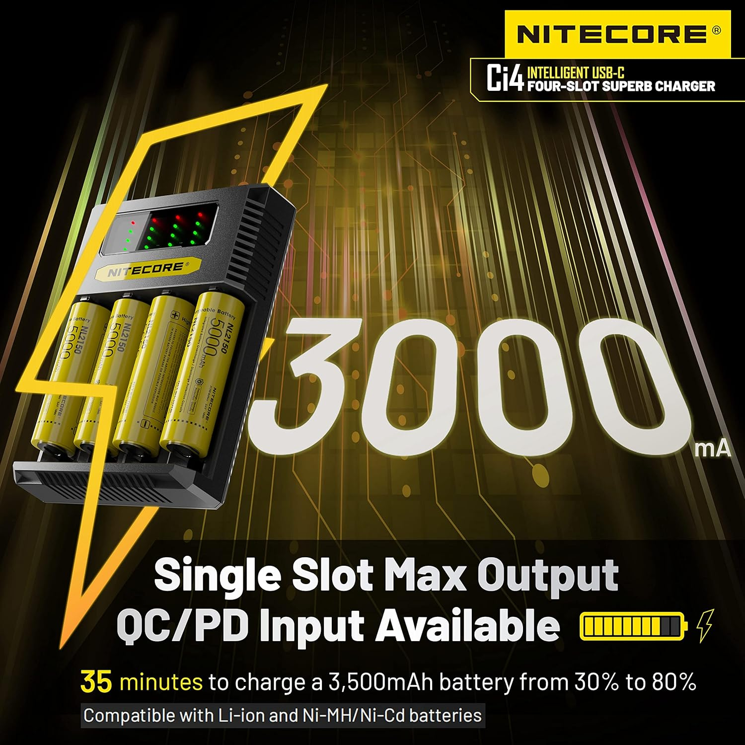 | Slots / Capacity | 4 independent slots for Li-ion, IMR, Ni-MH, or Ni-Cd batteries |