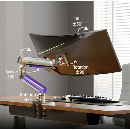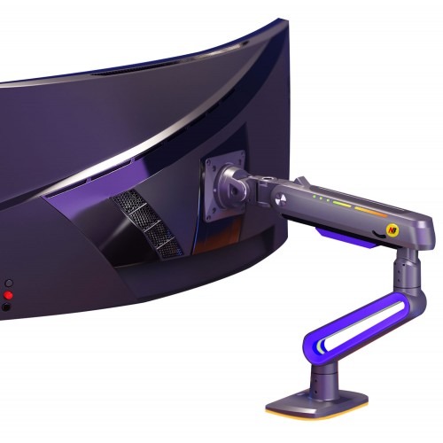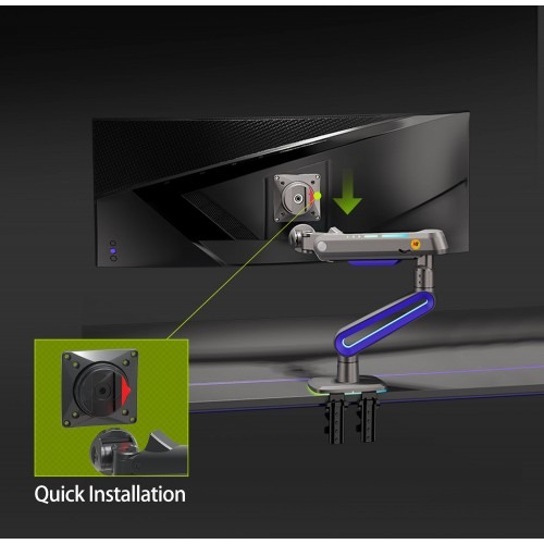 The North Bayou G70 Gaming Monitor Arm is a premium mounting solution designed to support large monitors ranging from 32″ to 60″ in size. With a robust weight capacity of 2–20 kg (4.4–44 lbs) per arm, it ensures stability and durability for heavy displays. The arm features a gas spring mechanism that allows for smooth adjustments in height, tilt, swivel, and rotation, providing ergonomic flexibility to enhance comfort and productivity. Its sleek design and integrated RGB lighting add a modern touch to any gaming or professional setup.