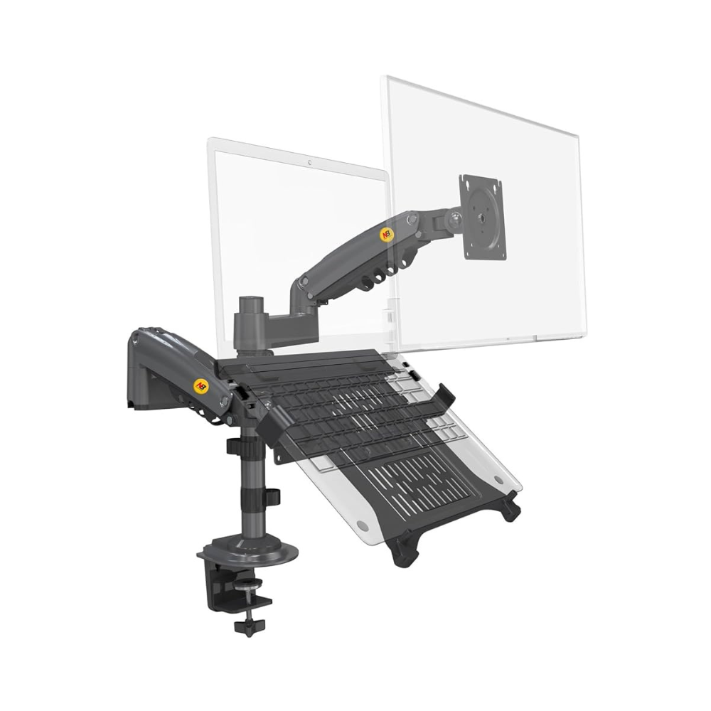 The North Bayou H180-FP Dual Arm Mount is a versatile 2-in-1 solution combining support for one laptop and one monitor. One arm accommodates laptops from 10″ to 17″, while the other supports monitors from 17″ to 27″. The mount allows for smooth tilt, swivel, rotation, and height adjustments to promote ergonomic comfort and optimize desk space. Its sturdy build and cable management system make it ideal for home offices, studios, or gaming setups.