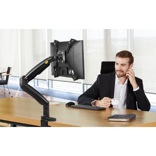 Designed for 17″ to 27″ monitors weighing up to 6.5 kg (14.3 lbs), it provides a 75 × 75 mm VESA interface for seamless compatibility.