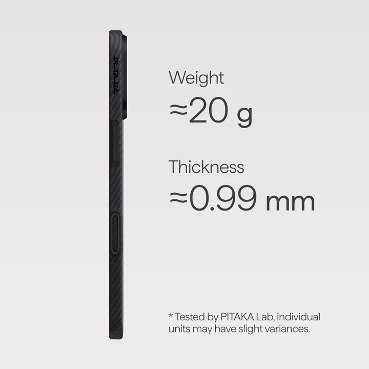 The PITAKA Ultra Slim Case for iPhone 17 (Black/Grey) is an elegant, featherlight protective case designed for minimal bulk and maximum style. Constructed from premium aramid fiber, it offers excellent scratch and drop resistance while maintaining the sleek profile of your iPhone 17. The ultra-thin design ensures easy handling, pocket-friendly fit, and a comfortable grip, all while preserving full access to buttons, ports, and wireless charging capabilities.