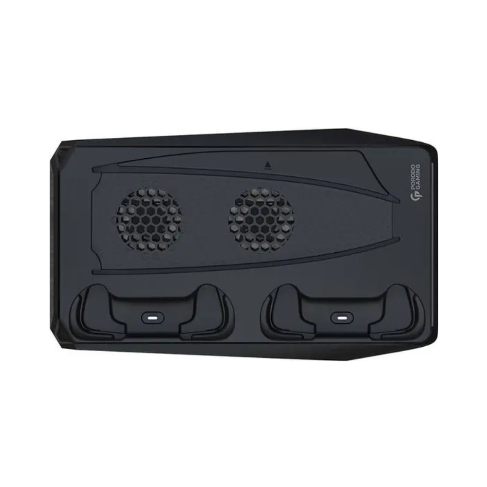 The Porodo Gaming Multi-Function PS5 Cooling and Charging Hub (Black) is designed to enhance your PlayStation 5 gaming experience by providing efficient cooling, convenient charging, and organized storage. This all-in-one accessory features dual high-speed fans with adjustable 3-level fan speed control to prevent overheating during intense gaming sessions. The hub also includes dual controller charging docks, a slide-out drawer that holds up to 12 game discs, a headphone stand, and USB-A ports for additional device charging. Its sleek black design seamlessly integrates with your gaming setup.