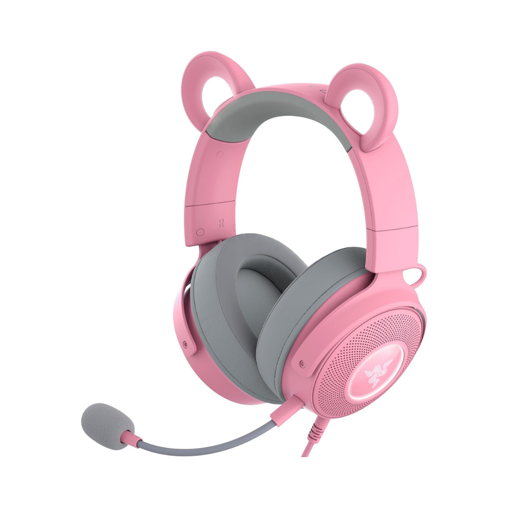 The Razer Kraken Kitty V2 Pro – Quartz Edition is a wired USB gaming headset designed for both style and performance. It features interchangeable ears (Kitty, Bear, and Bunny) so you can customize your look. Equipped with 50 mm TriForce Titanium drivers and virtual 7.1 surround sound, it delivers immersive audio. The detachable HyperClear cardioid microphone ensures clear communication, while Stream‑reactive Chroma RGB lighting responds to alerts and emotes for a dynamic, personalized setup. Cooling-gel infused memory foam ear cushions provide comfort for long gaming sessions.