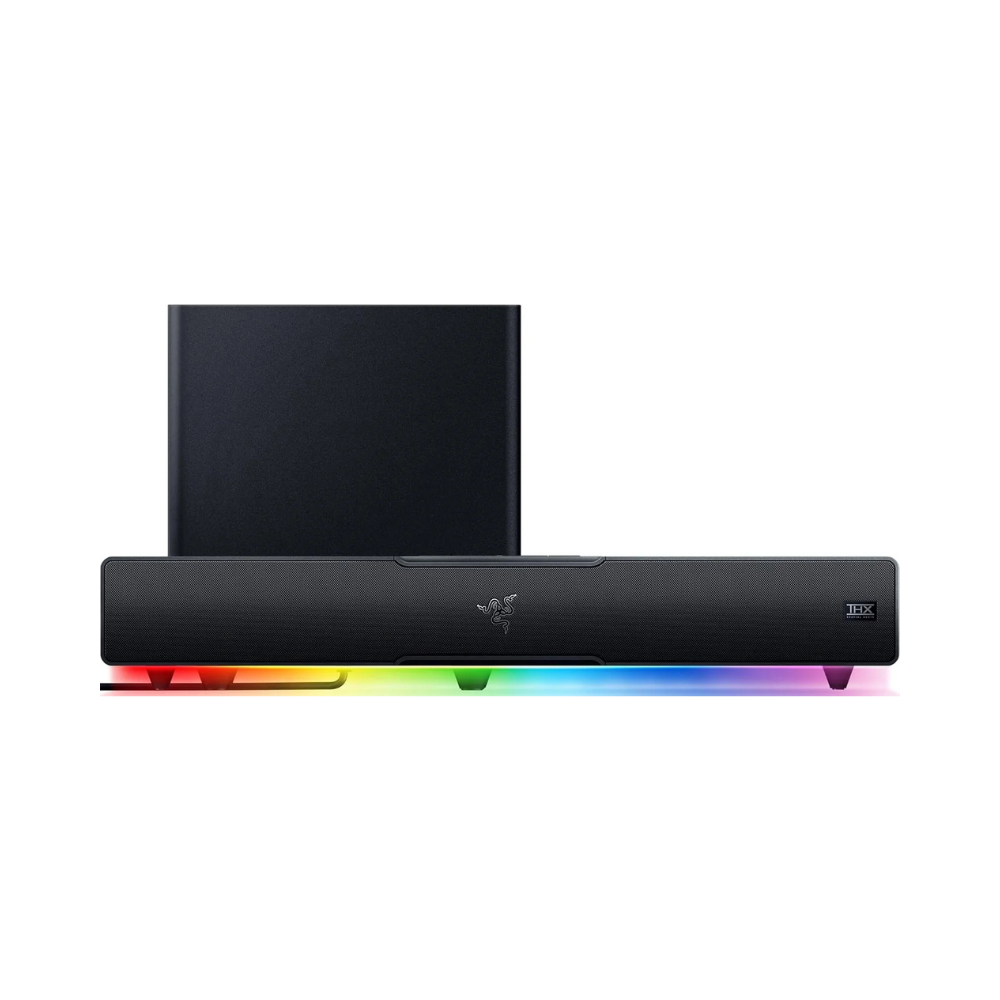 The Razer Leviathan V2 (RZ05-03920100-R3G1) is a **premium PC gaming soundbar with subwoofer** that delivers immersive, high-fidelity audio for gaming, movies, and music. Featuring **custom-tuned full-range drivers** and a **wireless subwoofer**, it provides rich bass, clear mids, and crisp highs. With **Razer Chroma RGB lighting** for dynamic visuals, **USB-C and Bluetooth connectivity**, and **THX Spatial Audio**, it creates an immersive soundscape for your gaming setup. The compact soundbar design ensures it fits neatly under monitors without taking up much space.
