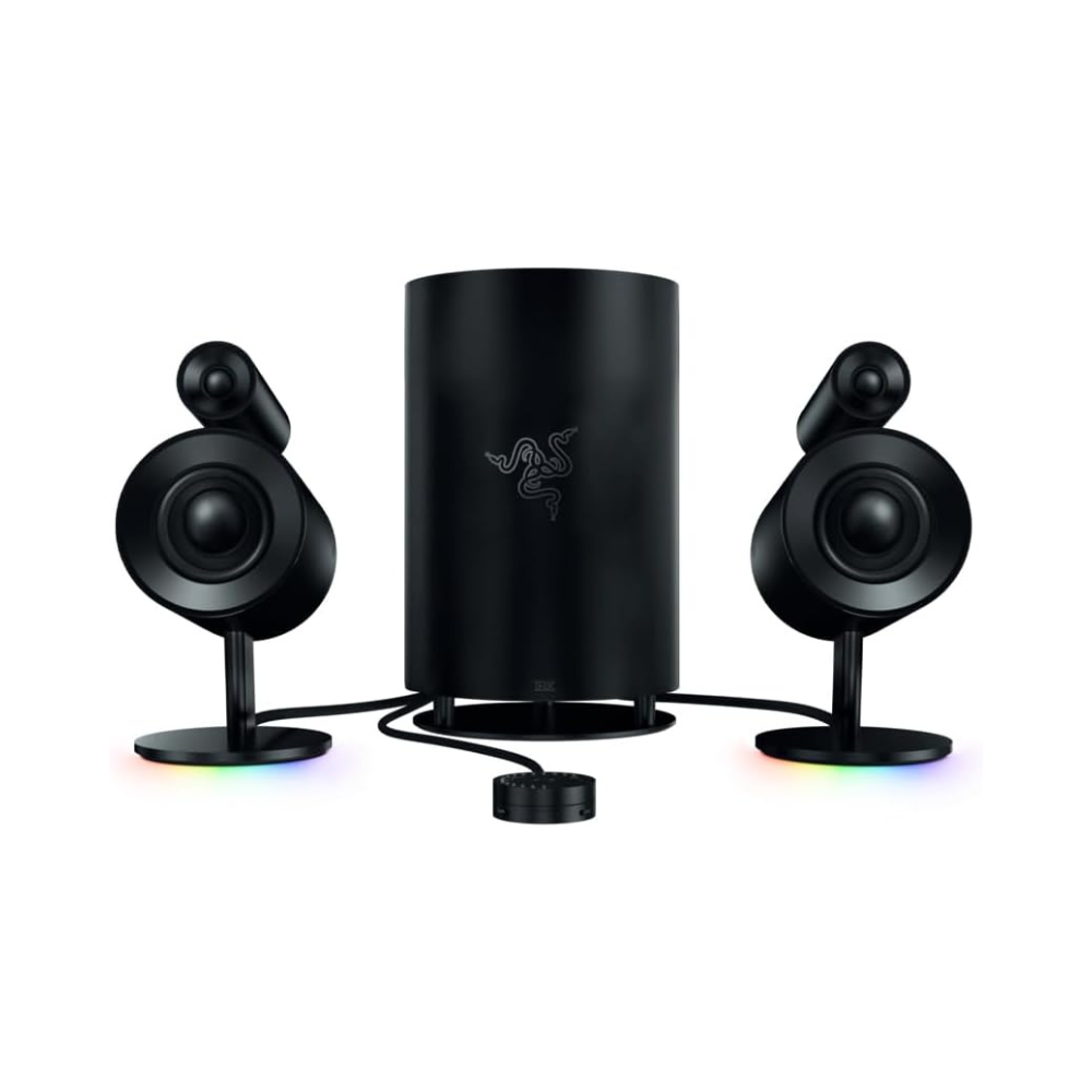 The Razer Nommo Pro 2.1 Gaming Speakers (THX Certified) are a premium desktop audio system designed to deliver immersive, high-fidelity sound for gaming, music, and movies. Certified by THX for cinematic clarity, the Nommo Pro features dual full-range satellite speakers with silk-dome tweeters and a downward-firing subwoofer for deep, powerful bass. The system supports multiple connectivity options—including USB, Optical, 3.5 mm, and Bluetooth 4.2—and integrates seamlessly with Razer Chroma RGB lighting. It includes a convenient control pod for easy volume, source, and mute adjustment, offering an elegant balance of performance and aesthetics for any setup.