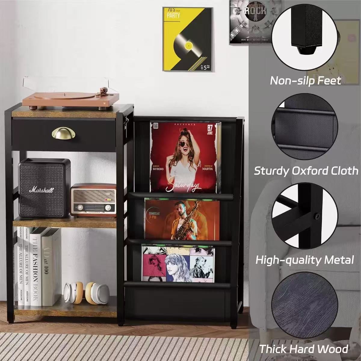 Sturdy and Stable:The record player stand table shelf is made of strong wooden boards,thicker irons and adjustable feet which is friendly touch,sturdy and secure.Crafted from long-lasting materials, including a sturdy metal frame and high-quality oxford fabric,this record storage organizer is built to last,it offers reliable support and protection for your vinyl records,ensuring long-term storage and preservation.