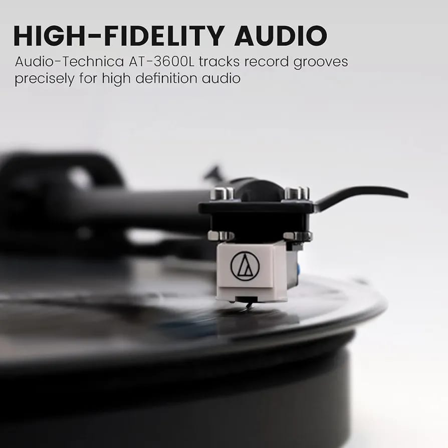 Equipped with an Audio-Technica AT-3600L moving-magnet cartridge, it delivers reliable performance and easy stylus replacement.