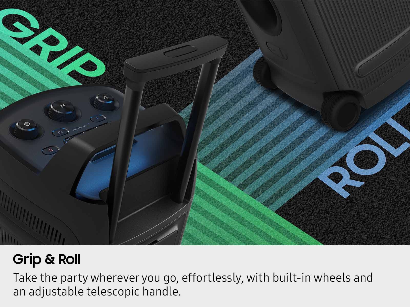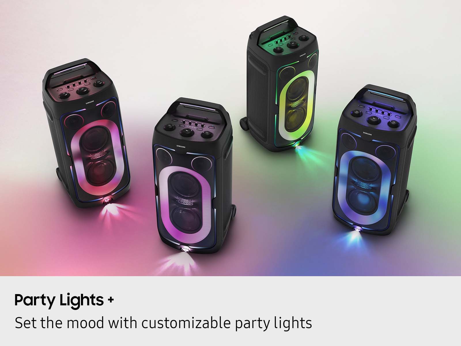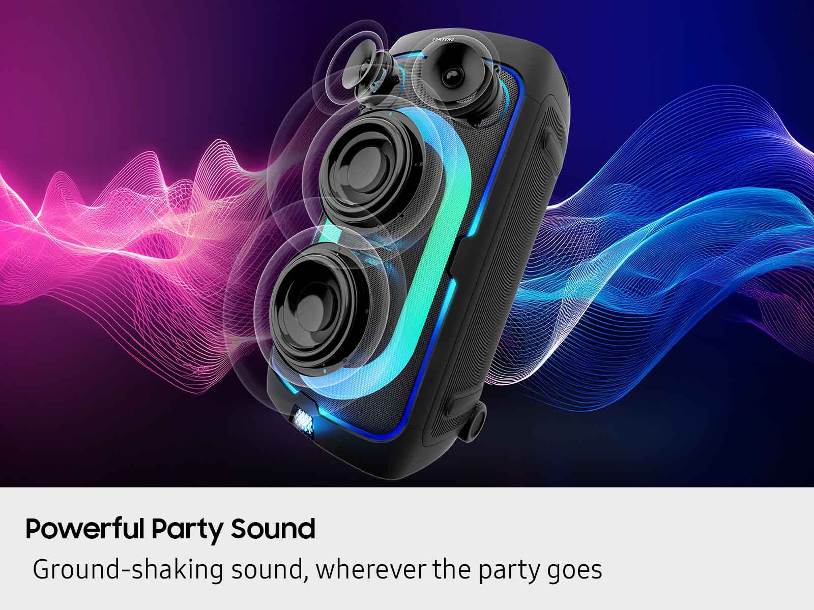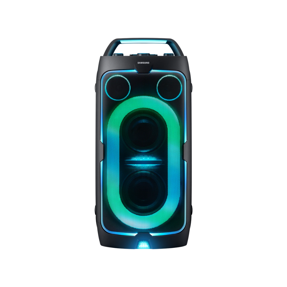 The Samsung Sound Tower MX-ST50F is a powerful portable party speaker designed for home, outdoor, and social gatherings. With 240 W max output, dual woofers, and tweeters, it delivers room-filling sound with rich bass and crisp treble. Its built-in rechargeable battery provides up to 18 hours of playtime, while IPX4 splash resistance ensures safe use near water or during light rain. The speaker features Bluetooth connectivity, USB playback, mic/guitar inputs, and customizable LED party lights, making it perfect for karaoke, DJ sessions, or streaming music from your devices. Equipped with wheels and a telescopic handle, the MX-ST50F combines portability, durability, and immersive audio for any occasion.