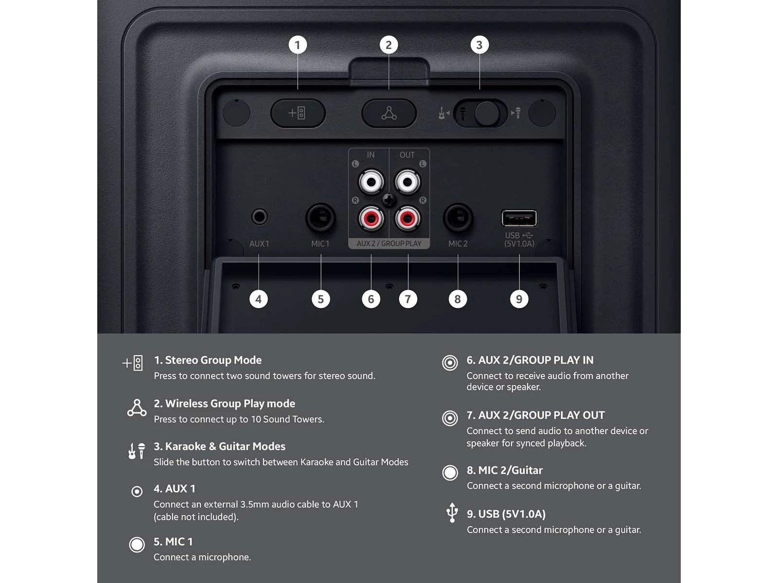 | Connectivity | Bluetooth, USB playback, 3.5 mm aux, mic/guitar input |