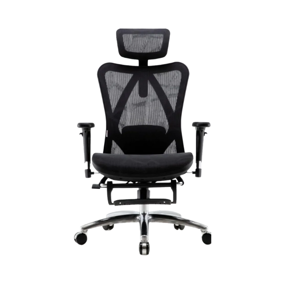 The SIHOO M57C-201-JT is a high-end full-mesh ergonomic office chair built for breathability, long-term comfort, and precise adjustability. It features a premium mesh backrest, adjustable headrest, and an elastic moth-shaped lumbar system that supports natural spinal alignment. With 4D PU-topped armrests, three-position locking recline, and a multi-functional mechanism, the chair adapts to a variety of working postures. A steel base, PU casters, Class-3 chrome gas lift, and retractable footrest ensure durability and day-long comfort.