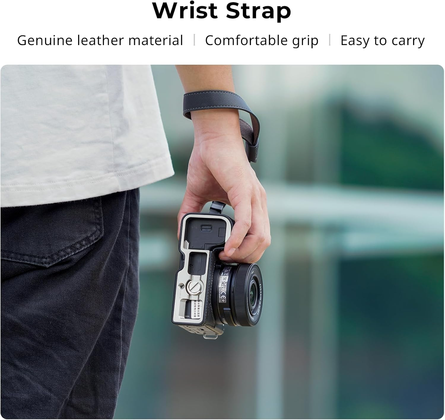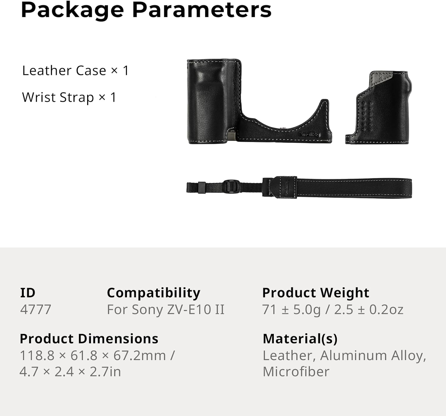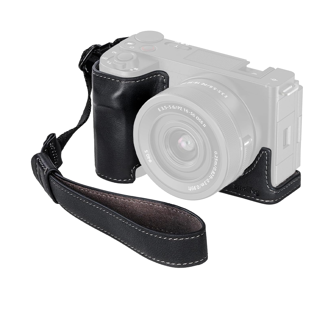 The SMALLRIG Camera Leather Case with Wrist Strap for Sony ZV-E10 II provides stylish and reliable protection for your Sony ZV-E10 II camera. Crafted from premium genuine leather with a suede-lined interior, this case safeguards your camera from scratches and bumps while maintaining full access to all buttons, ports, and the battery compartment. The included wrist strap and built-in foam hand grip enhance comfort and handling for secure, worry-free shooting.