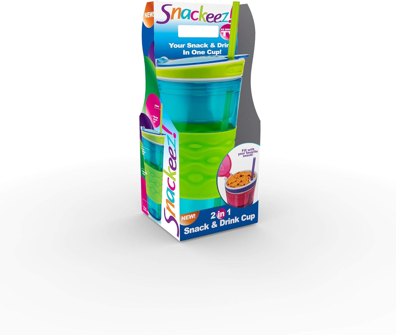 The Snackeez Travel Snack & Drink Cup with Straw, Blue, 16 oz is a convenient all-in-one solution for on-the-go snacking and drinking. This innovative cup combines a 16 oz drink holder and a 4 oz snack compartment, allowing you to enjoy your favorite beverage and snack simultaneously. The spill-proof design features a hinged flip-top lid and built-in straw to keep snacks fresh and secure. Dishwasher safe (top rack) for easy cleaning, suitable for kids and adults.