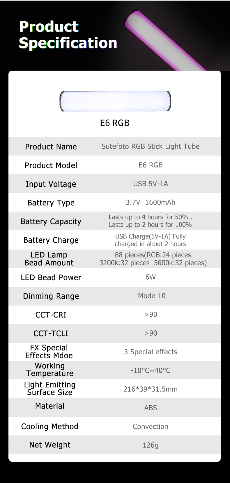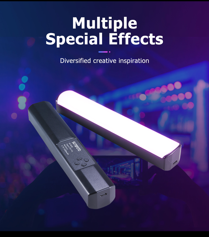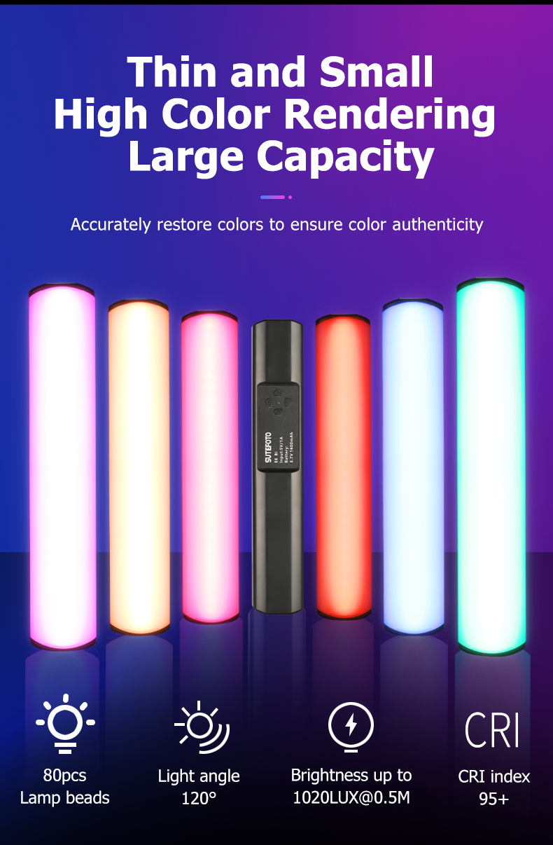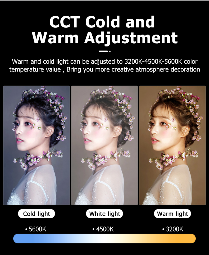 Small size and strong brightness with 21.6cm size and 88 enhanced LED lamp beads. 32 cold lights + 32 warm lights + 24 enhanced RGB LED lamp beads, CCT mode supports 2800K-10000K wide color temperature adjustment; Support RGBCW Mode / HSI Full Color Mode / FX Special Effect Mode / CCT Mode Three light effect modes – Hue, Brightness and Saturation.