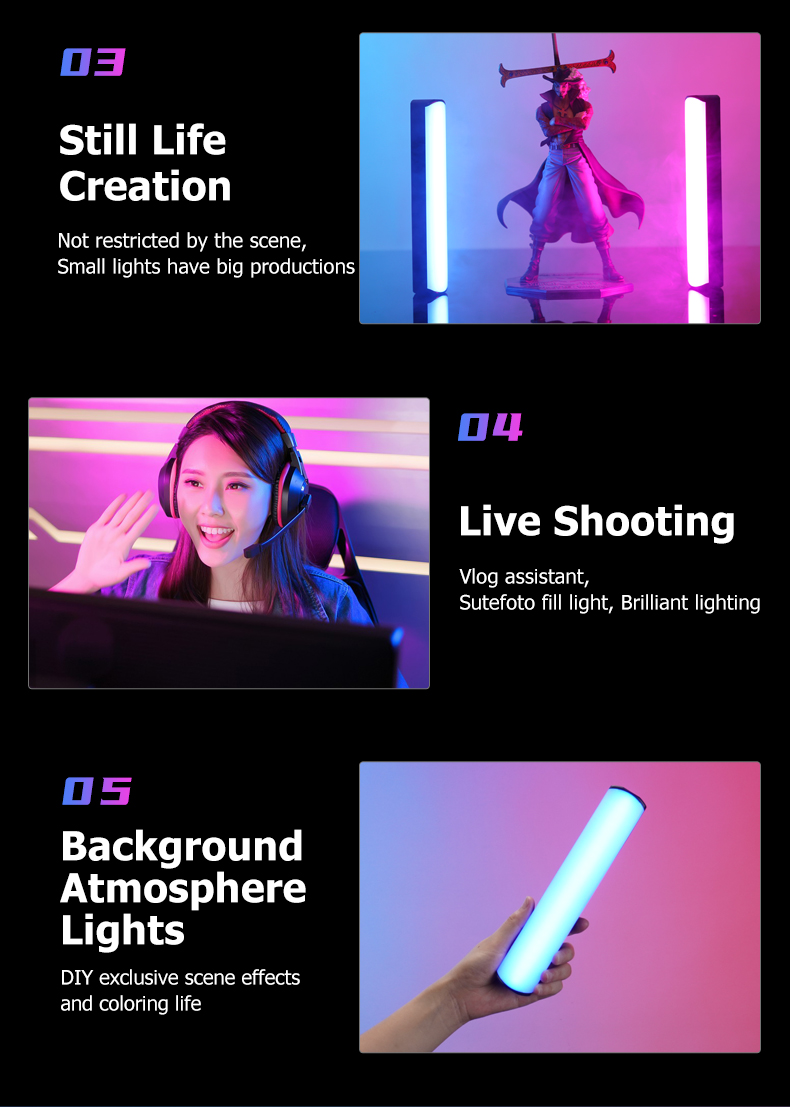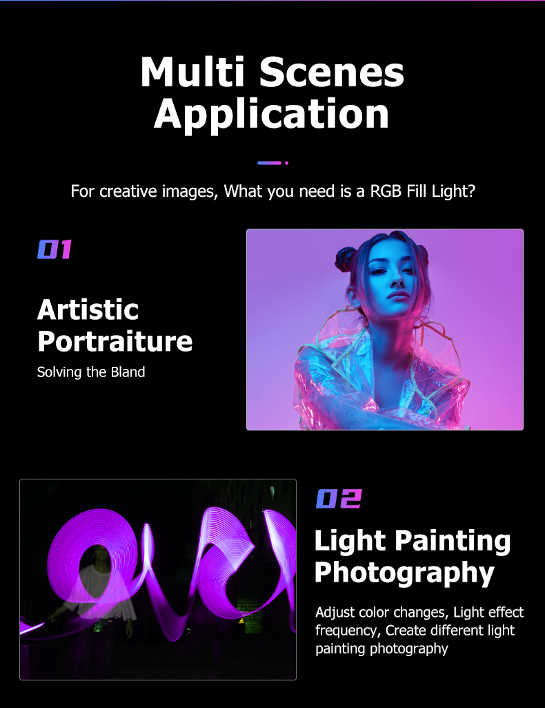 Widely functional & 360 colours This light supports 10 scene modes, up to 360 colours!! including Cinema scenes, Fire truck scenes, Fast RGB scenes, SOS scenes and Candlelight scenes etc. so it’s really useful and multipurpose. Widely applications for shooting needs, suitable for self-broadcasting, live streaming, makeup, YouTube, vlogging, photography, etc.