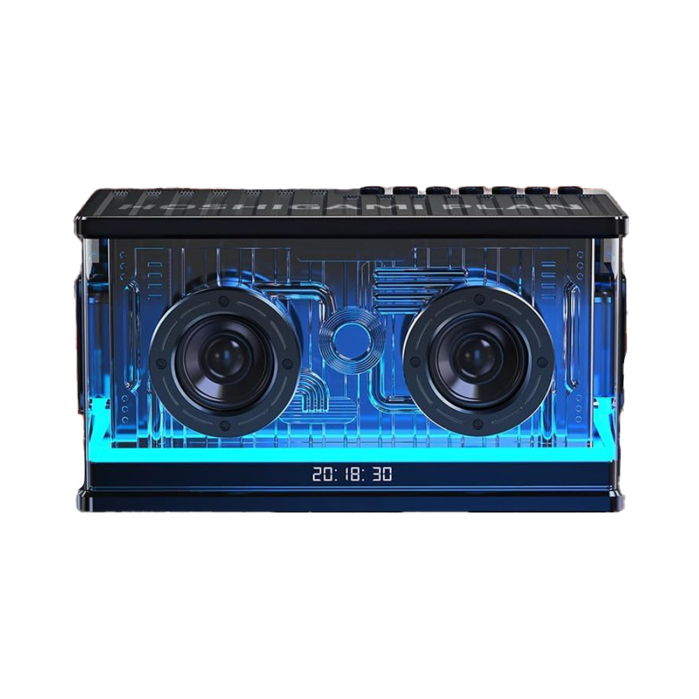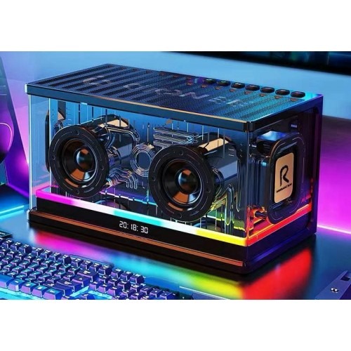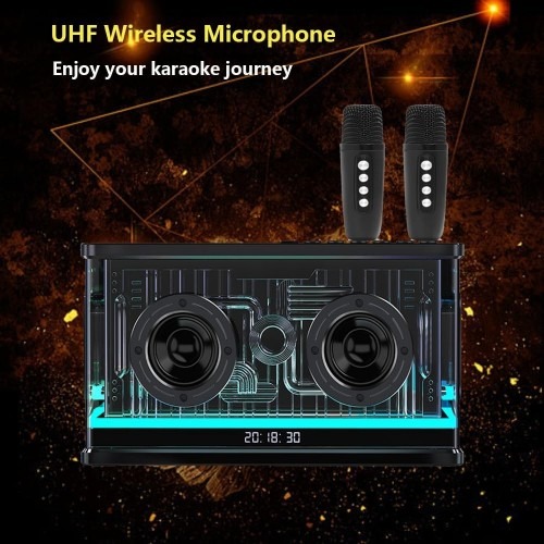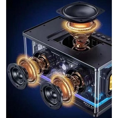Connectivity is versatile: the speaker supports **Bluetooth**, **USB-A**, **Aux-in**, **TF card**, and even comes with a **UHF wireless microphone**, making it ideal for party karaoke or hands-free announcements. The aesthetic is bold and industrial, with a transparent visualization chassis that resembles mechanized machinery, giving it a distinct and modern look. The JY‑26 blends **acoustics, lighting, electronics, and mechanical design** into one seamless system for a unique audio experience.