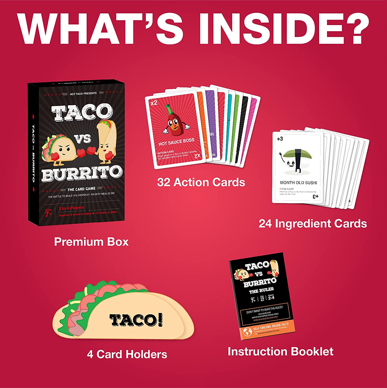 The Taco vs Burrito Card Game is a fast-paced, fun, and strategic card game where players compete to build the best taco or burrito creations while sabotaging their opponents. With quirky food-themed cards, unexpected combos, and humorous gameplay, it’s perfect for parties, family game nights, or casual hangouts.