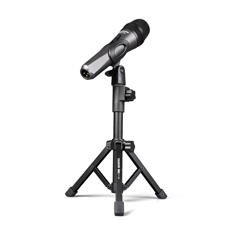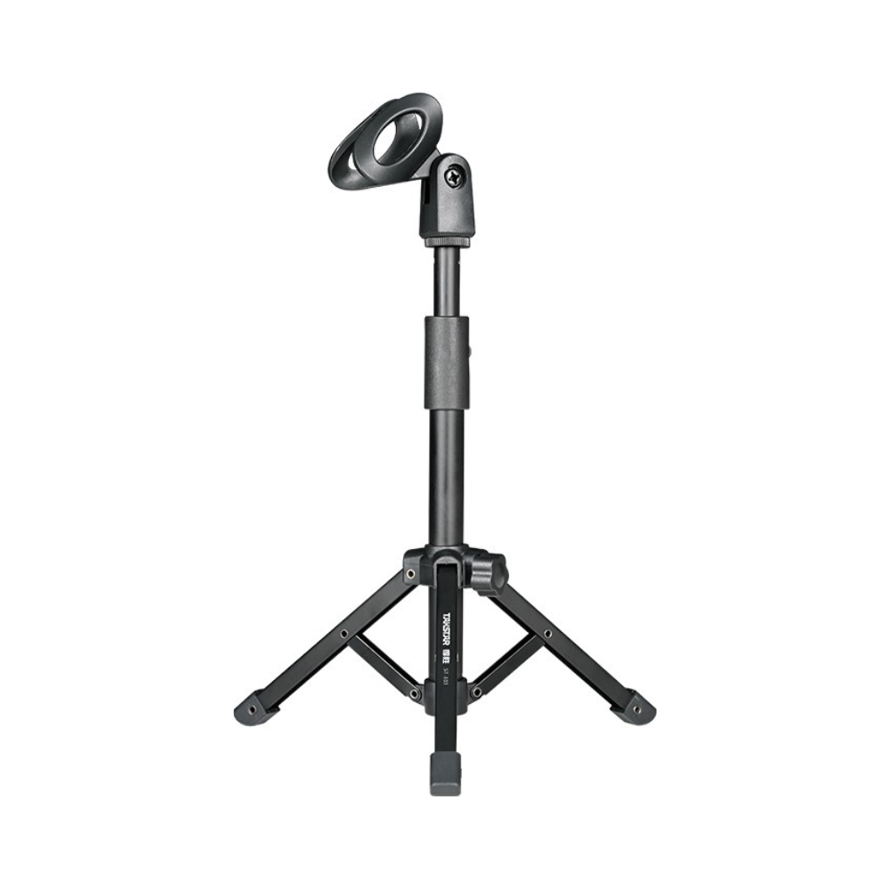 The TAKSTAR ST‑103 is a compact metal microphone stand designed for tabletop or desktop use. Ideal for live streaming, podcasts, recording, and karaoke, it features a two-section telescopic design with a tripod base for stability and portability. The stand includes an interchangeable holder that can accommodate either a microphone or a smartphone, offering flexible setup options.