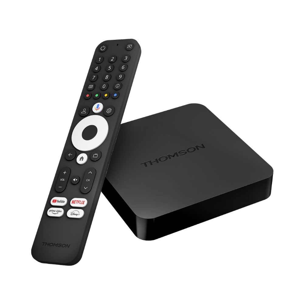 The Thomson Streaming Box 240M is a compact 4K UHD streaming device powered by Google TV, designed to transform any television into a smart entertainment hub. It delivers ultra-sharp 4K visuals (four times the detail of Full HD) and seamless access to popular streaming services like Netflix, Disney+, Prime Video, and YouTube. Equipped with a Bluetooth remote featuring Google Assistant voice control, you can search and control playback hands-free. Built-in Wi-Fi, Ethernet, and Google Cast make streaming or casting from your phone or laptop effortless. With a smooth Google TV interface, app personalization, and HDR 10 support, the Streaming Box 240M brings a powerful and intuitive smart-TV experience to any display.