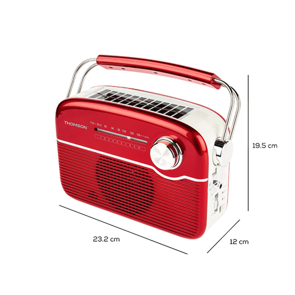 The Thomson Radio Bluetooth Retro Vintage – Solar Battery Powered combines timeless retro design with modern audio technology for everyday listening at home or on the go. Designed for convenience and portability, it lets you enjoy classic FM radio stations or stream music wirelessly from your smartphone or tablet via Bluetooth. The built-in rechargeable battery, along with USB-C and solar charging support, makes it especially practical for outdoor use, picnics, or energy-efficient listening. With simple controls, a sturdy build, and a warm vintage aesthetic, the RTS450BTR is ideal for users who appreciate classic style paired with modern functionality.