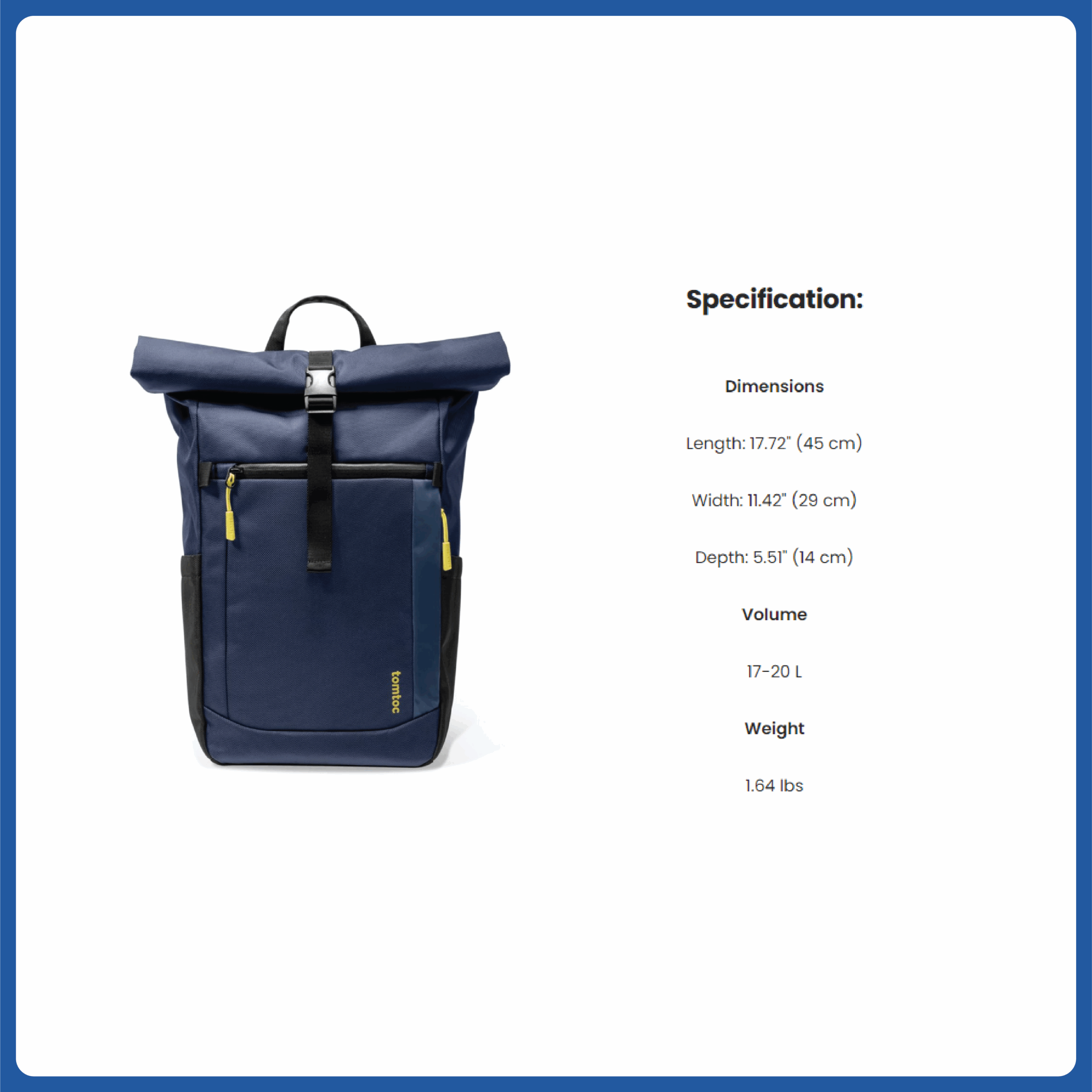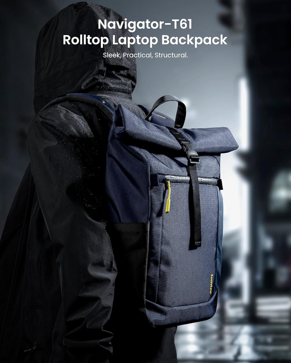 The tomtoc Navigator‑T61 Rolltop Backpack (15.6″, Dark Blue) offers a smart blend of flexible capacity and rugged commuter design. With its roll‑top closure, water‑resistant 1680D recycled fabric, and sleek urban look, it adapts easily from daily desk carry to light travel.
