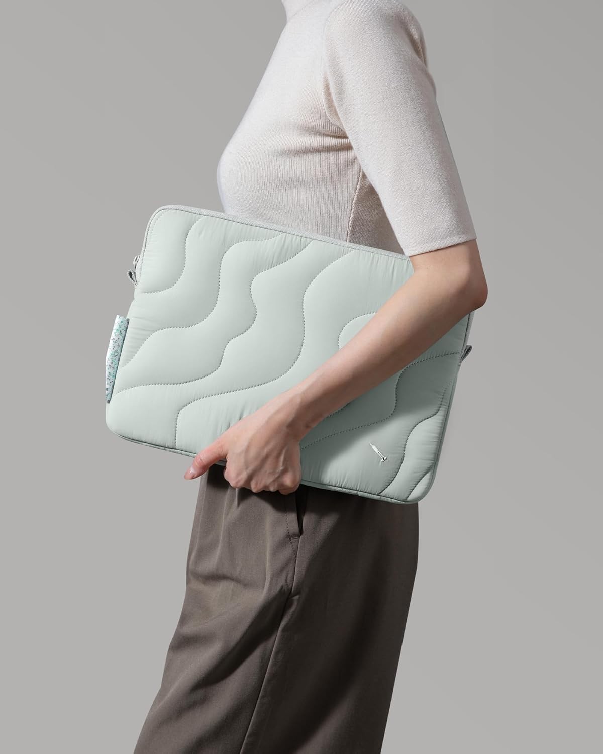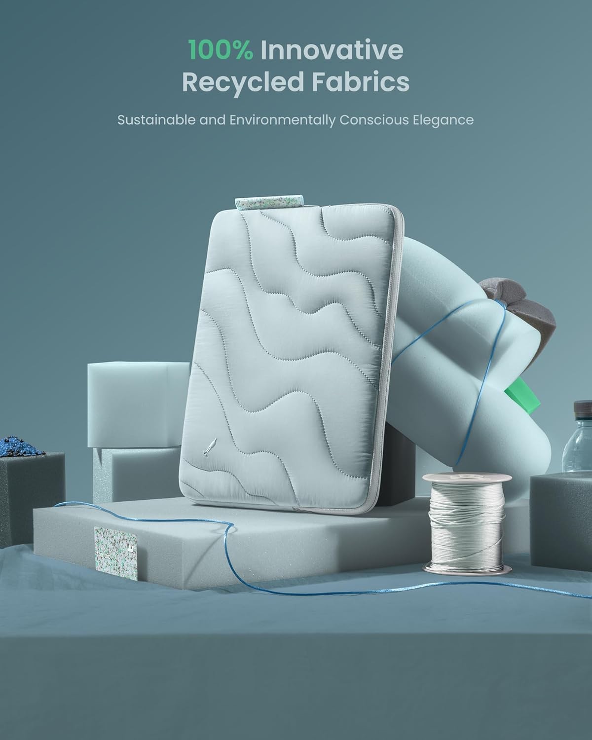 Crafted from over 90% recycled materials, including eco‑friendly polyester/cotton fabrics and YKK NATULON® sustainable zippers, this sleeve combines style, comfort and responsibility. The puffy quilted design offers a snug and light feel, making it a perfect protective sleeve to slip into a larger bag or use on its own for slim‑carry scenarios.