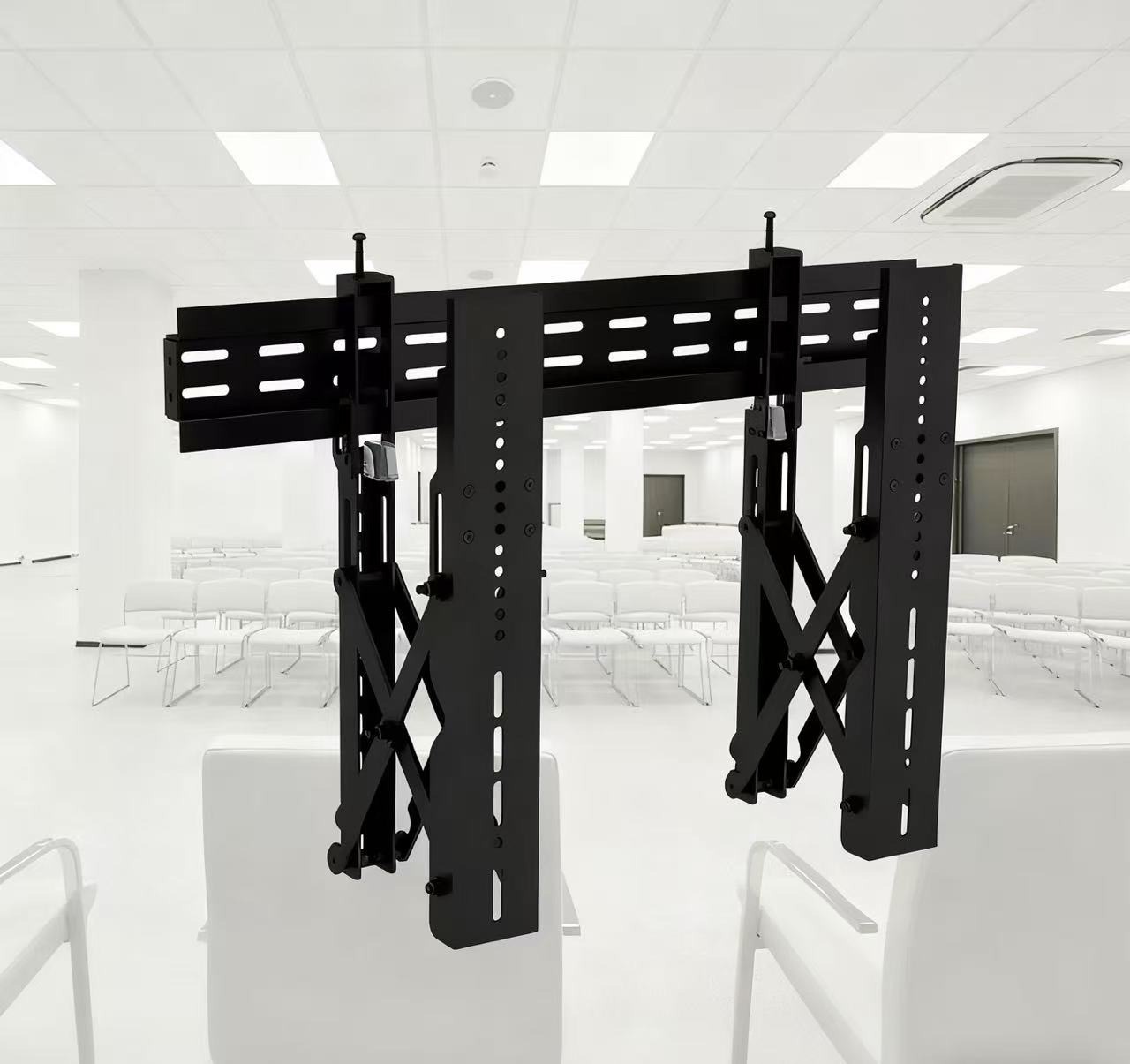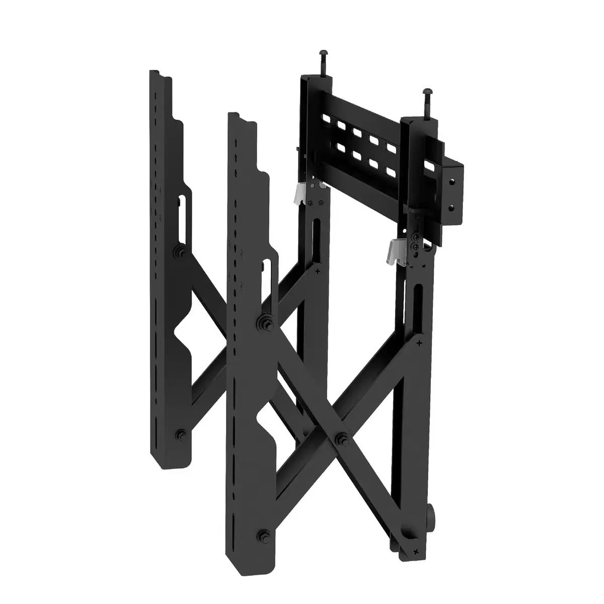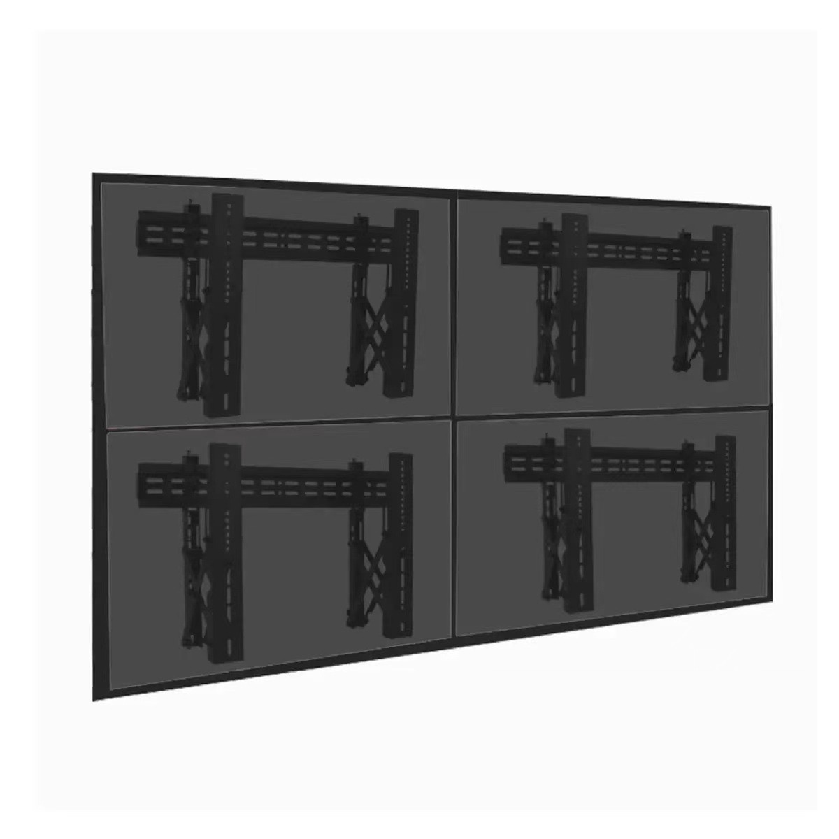 This wall mount is a professional solution designed to create video walls with VESA-standard 49″ to 65″ screens weighing up to 45 kg. Each bracket consists of a wall plate and two vertical sliding screen bars featuring a stretch Push Pull opening mechanism to ensure easy opening and access to the rear of the screen for maintenance. The wall plate has connection holes at each end so you can combine several brackets to create your video wall, depending on the number of screens you need to install. These two VESA bars offer the option of adding a security padlock and are fitted at the top with an adjustment screw that lets you adjust the horizontal level of the screen to obtain a perfectly straight line. The stand is therefore aimed at installers and digital signage professionals who are looking for an easy-to-install, functional solution for a perfect aesthetic result.